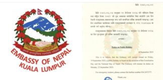 नेपालको संविधान दिवसको अवसरमा मलेसियास्थित नेपाली राजदूतावास बन्द रहने