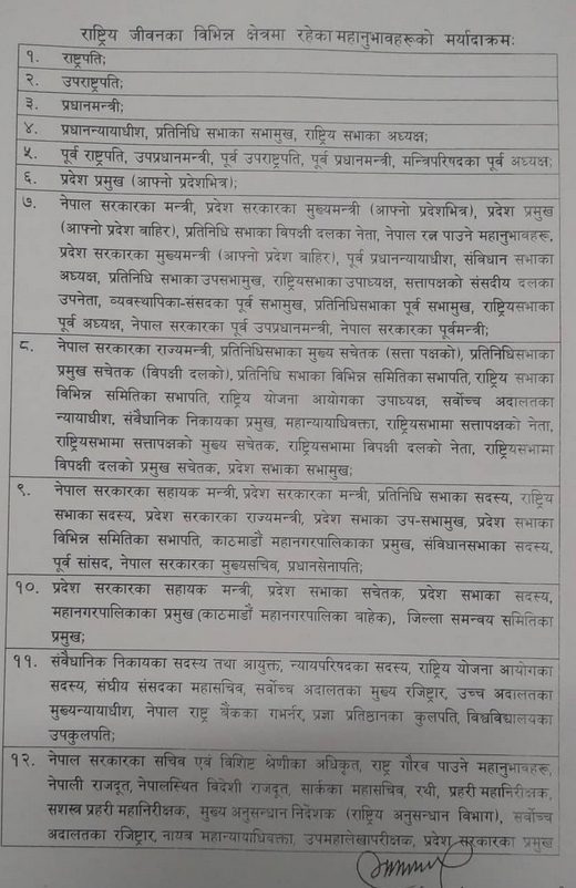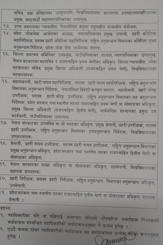 प्रदेशका मन्त्री र केन्द्रका सांसद, राज्यमन्त्री, काठमाण्डु महानगरका मेयर, पूर्वसांसद, मुख्यसचिव र प्रधानसेनापति नवौं नम्बरमा छन् । अन्य महानगरका मेयर, प्रदेशका सहायकमन्त्री लगायत दशौं नम्बरमा छन् ।