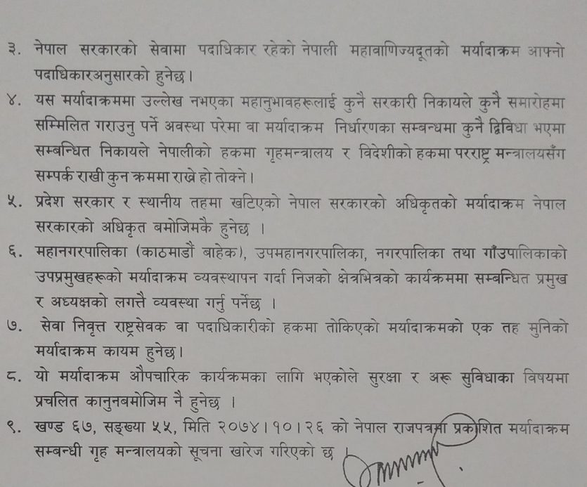 त्यस्तै नगरपालिकाका मेयरलाई सहसचिवभन्दा तल राखिएको थियो । मर्यादाक्रममा असहमति जनाउँदै नगरपालिका संघ र गाउँपालिका महासंघले प्रधानमन्त्रीलाई ध्यानाकर्षणसमेत बुझाएका थिए ।