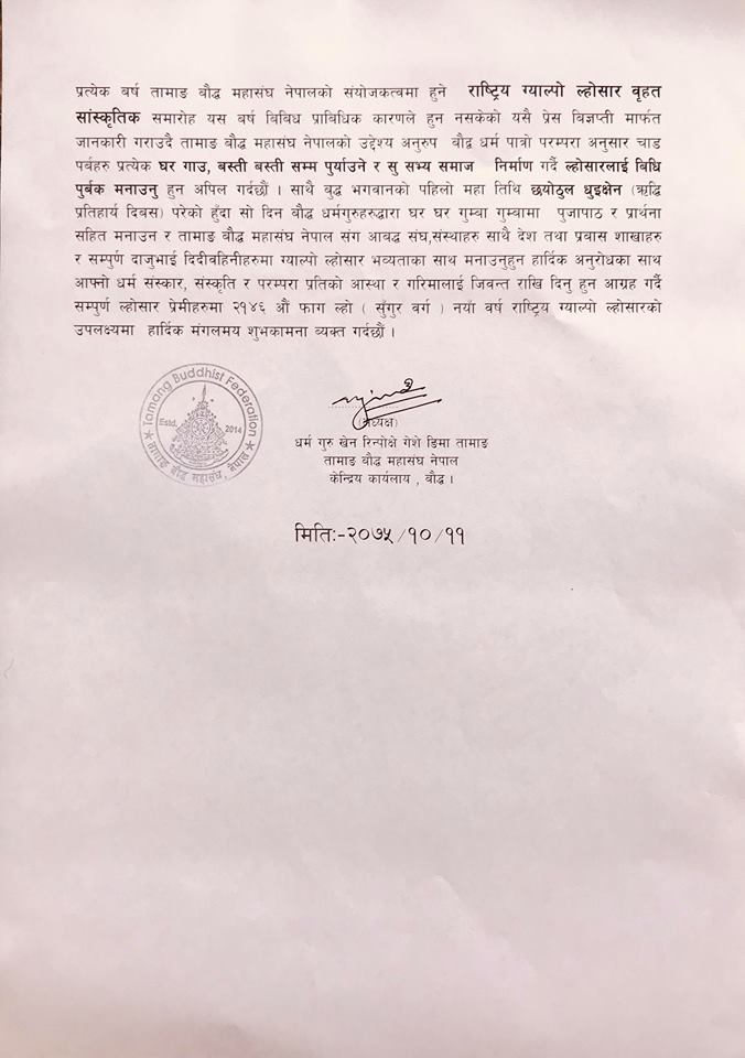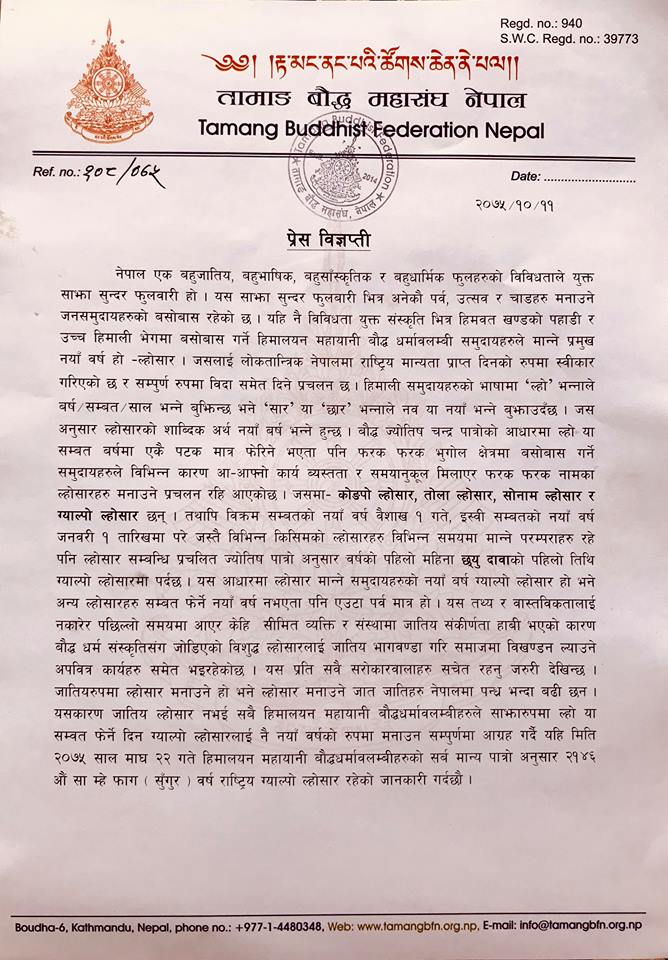 तामाङ बौद्ध महासंघ नेपालले लोसार सम्बन्धि प्रेस बिज्ञप्ती सार्वजनिक गरिएको छ ।