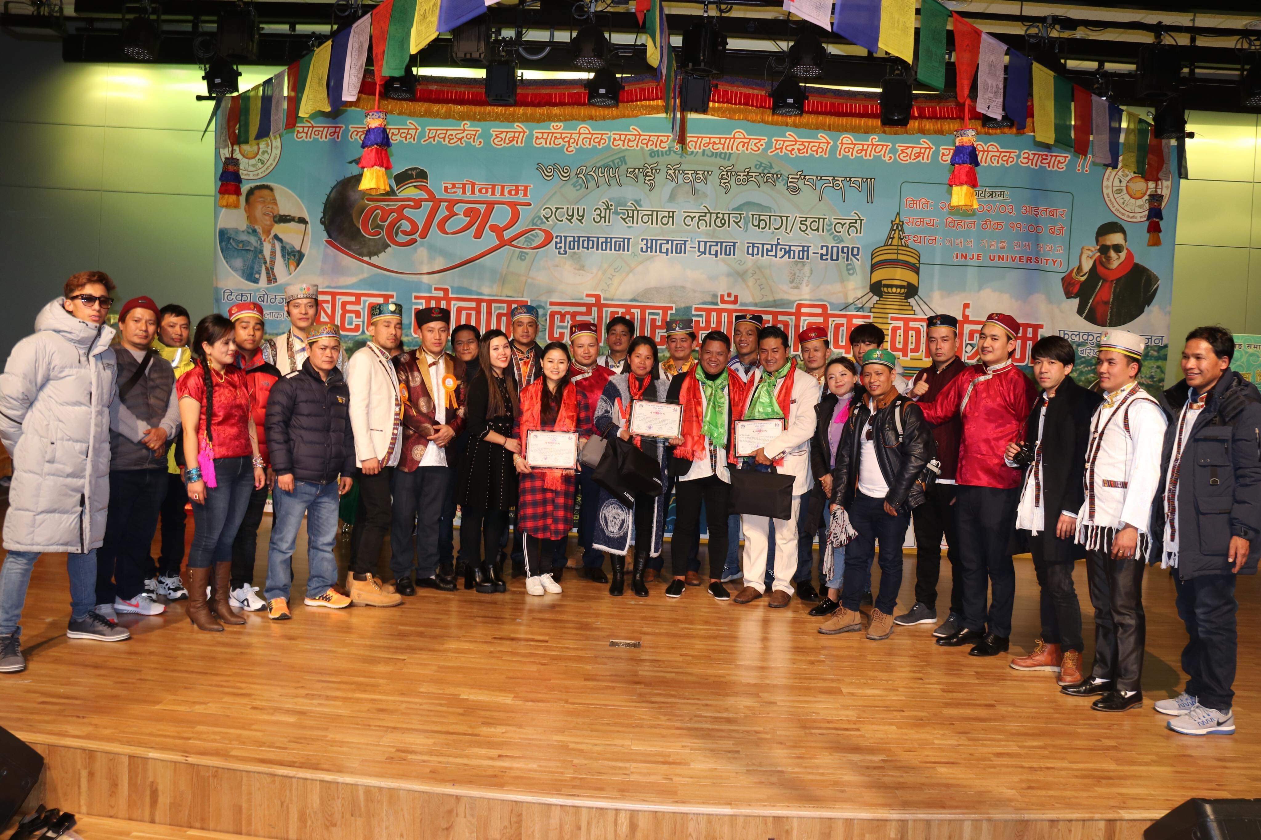दक्षिण कोरिया । नेपाली राष्ट्रिय चाड एवंम् तामाङ समुदायको महान चाड मन्जुश्री सम्बत २८५५ औं सोनाम ल्होछार(फाग्/ड्वा ल्हो) विविध कार्यक्रमका साथ दक्षिण कोरियाको किम्हे शहरमा सभ्य र भव्य ढंगले आइतबार सम्पन्न भएको छ । तामाङ समाज ख्यङ्साङ्नाम्दो/बुसान दक्षिण कोरियाले लामा गुरुबाट विशेष पूजा र विविध सांस्कृतिक कार्यक्रम सहित सोनाम ल्होछार मनाएको छ । कुकुर वर्ग (नागी ल्हो) लाई बिदाइ र बदेल वर्ग (फाग्/ड्वा ल्हो) को स्वागत गर्दै शुभकामना आदानप्रदान कार्यक्रम सम्पन्न भएको हो ।