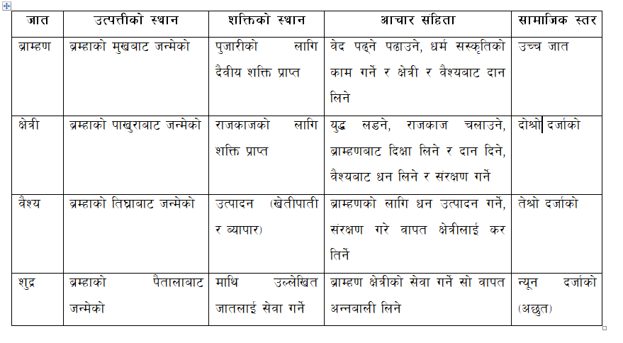 डुमनले जात व्यवस्थालाई हिन्दु धारणामा आधारित सामाजिक व्यवस्था भनेका छन । जसमा शुद्ध–अशुद्धको भावनामा आधारित हुने बताईन्छ । हिन्दु धारणा अनुसार मानिसहरुको सृष्टि ब्रम्हाले गरेको र सृष्टिकालदेखि नै दैवीयरुपमा विभेद रहेको छ । जसलाई तलको तालिकामा उल्लेख गरिएको छ: