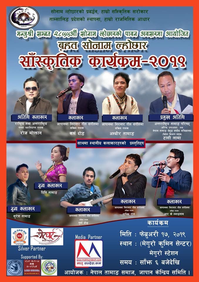 निर्धारित कार्यक्रम अनुसार भोलि ९ तारिखका दिन बेल्जीयम तामाङ समाजको आयोजनामा बृहत सोनाम ल्होछार साँस्कृतिक कार्यक्रम हुने भएको छ । त्यसैगरि त्यसैगरि तामाङ समाज पोर्चुगलमा १० तारिख, १२ तारिखमा नेपाल तामाङ घेदुङ फिन्ल्याण्डको आयोजनामा १२ तारिखमा कार्यक्रम हुने भएको छ । त्यस्तै तामाङ समाज जापानको आयोजनामा पनि बृहत सोनाम ल्होछार साँस्कृतिक कार्यक्रम हुने भएको छ ।