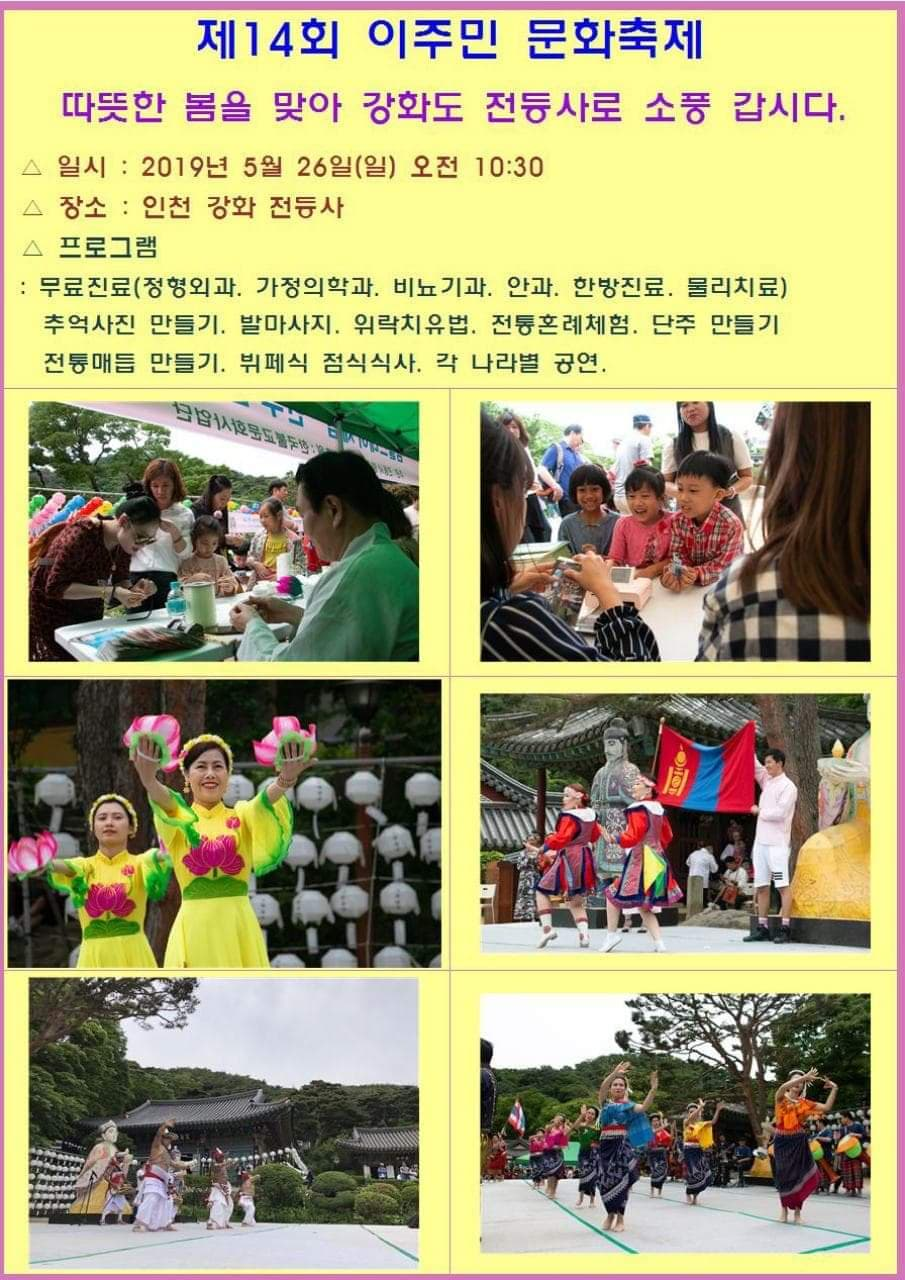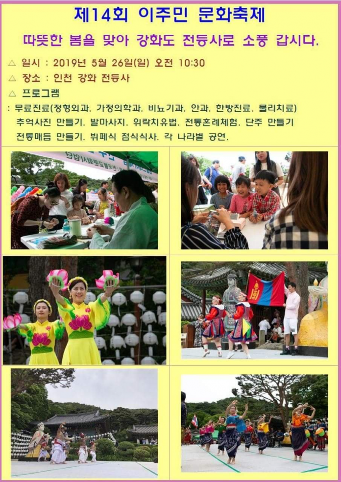 दक्षिण कोरिया । प्रत्येक बर्ष झै यो बर्ष पनि छान्दोङ्सा गुम्बाले कोरियाको बसन्त ऋतु र गर्मीयामको समय पारेर मे २६ तरिख आइतबारका दिन “१४ औं आप्रवासी सांस्कृतिक महोत्सव” गर्न गइरहेको छ । कार्यक्रम छन्दोङ्सा गुम्बा इन्छन खाङ्ह्वास्थित हुनेछ ।