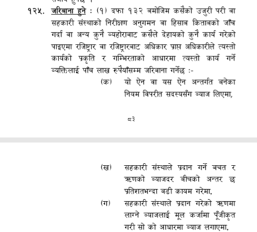 सहकारी ऐन २०७४ अनुसार कारबाही हुने विभागले जनाएको छ । ऐनको १२४ मा व्यवस्था गरिएअनुसार नगरे दफा १२५ अनुसार कारबाही हुनेछ । ऐन अन्र्तगत बनेका नियमविपरीत सदस्यसँग ब्याज लिएमा, ब्याजदरको अन्तर ६ प्रतिशतभन्दा बढी कायम गरेमा ५ लाख रुपैयाँसम्म जरिवाना हुनेछ । रातोपार्टीबाट