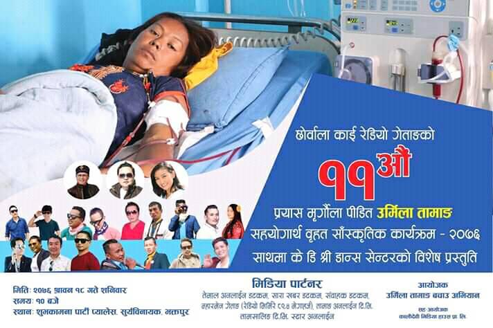 छोर्वाला काई रेडियो गेताङको ११ औ प्रयास रामेछाप जिल्ला दोरम्बा गाउँपालिका वडा ७, निवासी विगत २ वर्ष देखि दुबै मृगौला फेल भएको वर्ष ३५ की उर्मिला तामाङ बचाउ अभियान सहयोगार्थ बृहत साँस्कृतिक कार्यक्रम २०७६ को तयारी पुरा भएको अभियन्ता सुदिन लामाले जानकारी दिनु भयो ।
