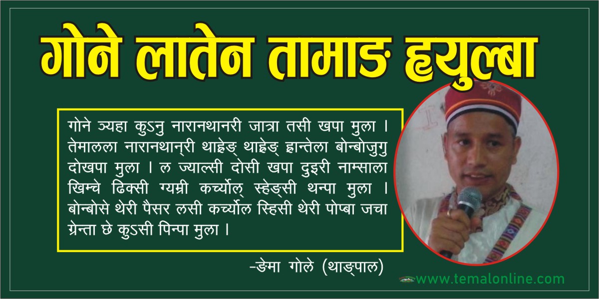 तेमाल ग्योइखररी गोर्गी नारानला लथान मुला । थेरी गोने ञ्यहारी जात्रा तसी खपा मुला । जात्रारी दोखपा ह्युल्बासे तामाङ फापा दोपा व्हाई ह्राङ ह्राङ्ला दाङ्री ९लय० कोसी खपा मुला । चरि मैना चरि लै लै ह्राङपा दाङ लसी व्हाई कोसी छुना लपा मुला । तेमालला गोले बोन्बोसेनोन् तिऽरे ङ्हाच्छा बुम्बा डुप्सी थे ठिग्यम्सेन् लथान्री निपा मुला । तेमाल गाङ्री नारान थान मुला । गोने ञ्यहा कुऽनु नारानथानरी जात्रा तसी खपा मुला । तेमालला नारानथान्री थाह्रेङ् थाह्रेङ्ला ह्रान्तेला बोन्बोजुगु दोखपा खपा मुला । ल ज्यल्सी दोसी खपा दुइरी नाम्साला खिम्चे ढिक्सी ग्यम्री कच्र्योल् स्हेङ्सी थन्पा मुला । बोन्बोसे थेरी पैसर लसी कच्र्योल स्हिसी थेरी पोप्बा जचा ग्रेन्ता छे कुऽसी पिन्पा मुला ।