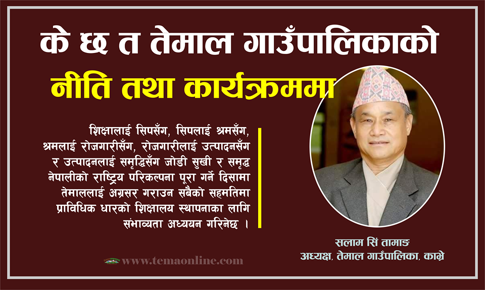 तेमाल गाउँपालिकाको पाँचौ गाउँ सभामा गाउँपालिकाका अध्यक्ष श्री सलाम सिं तामाङ ज्यूले प्रस्तुत गर्नु भएको आव २०७६/७७ को नीति तथा कार्यक्रम