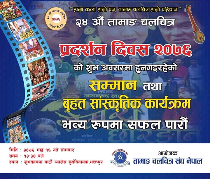 हाम्रो कला हाम्रो पन तामाङ चलचित्र हाम्रो पहिचान भन्ने नाराका साथ हुन गई रहेको २४औं चलचित्र प्रदर्शनी दिवसका अवसरमा सम्मान तथा बृहत साँस्कृतिक कार्यक्रम हुने बताएका छ ।साथै चलचित्र जगतमा योगदान दिनुभएको विभिन्न व्यक्तित्वहरुलाई सम्मान पनि गरिने तामाङ चलचित्र संघका अध्यक्ष विकु थोकरले जानकारी दिनुभयो ।