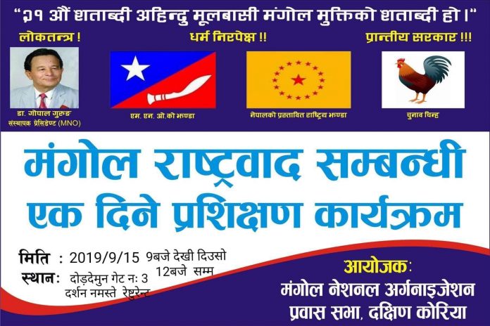 दक्षिण कोरिया । मंगोल नेशनल अर्गनाइजेशन प्रवास शाखा दक्षिण कोरियाको आयोजनामा “मंगोल राष्ट्रवाद” सम्बन्धी एकदिने प्रशिक्षण कार्यक्रम हुने भएको छ ।