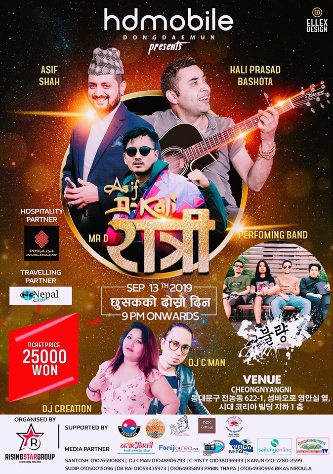 सो कार्यक्रमका लागि चर्चित संगीतकार तथा गायक कालीप्रसाद बास्कोटा, नायक तथा टेलीभिजन प्रस्तोता आसिफ शाह र मिस्टर डी नेपालबाट कोरिया आउने छन् । रात्री म्युजिकल डान्स पार्टीका आयोजक सन्तोष कुमार राईले बताउनुभयो ।कालीप्रसाद नेपाल आइडियलका जर्ज हुन भने आसिफ कार्यक्रम प्रस्तोता पनि हुन् ।