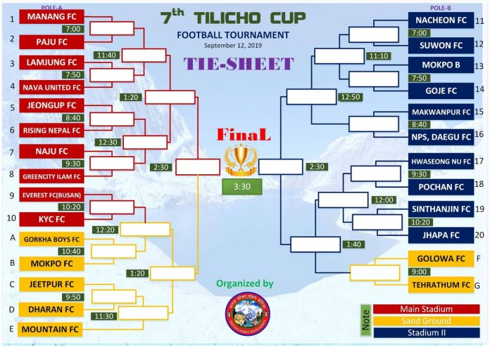 दक्षिण कोरिया । मनाङ परिवार दक्षिण कोरियाले छुसकको पहिलो दिन सेप्टेम्बर १२ तारिखमा आयोजना गर्न लागिरहेको “सातौं तिलिचो कप” फुटबल प्रतियोगिताको खेल तालिका (Tie-sheet) सर्वाजनिक गरेको छ ।