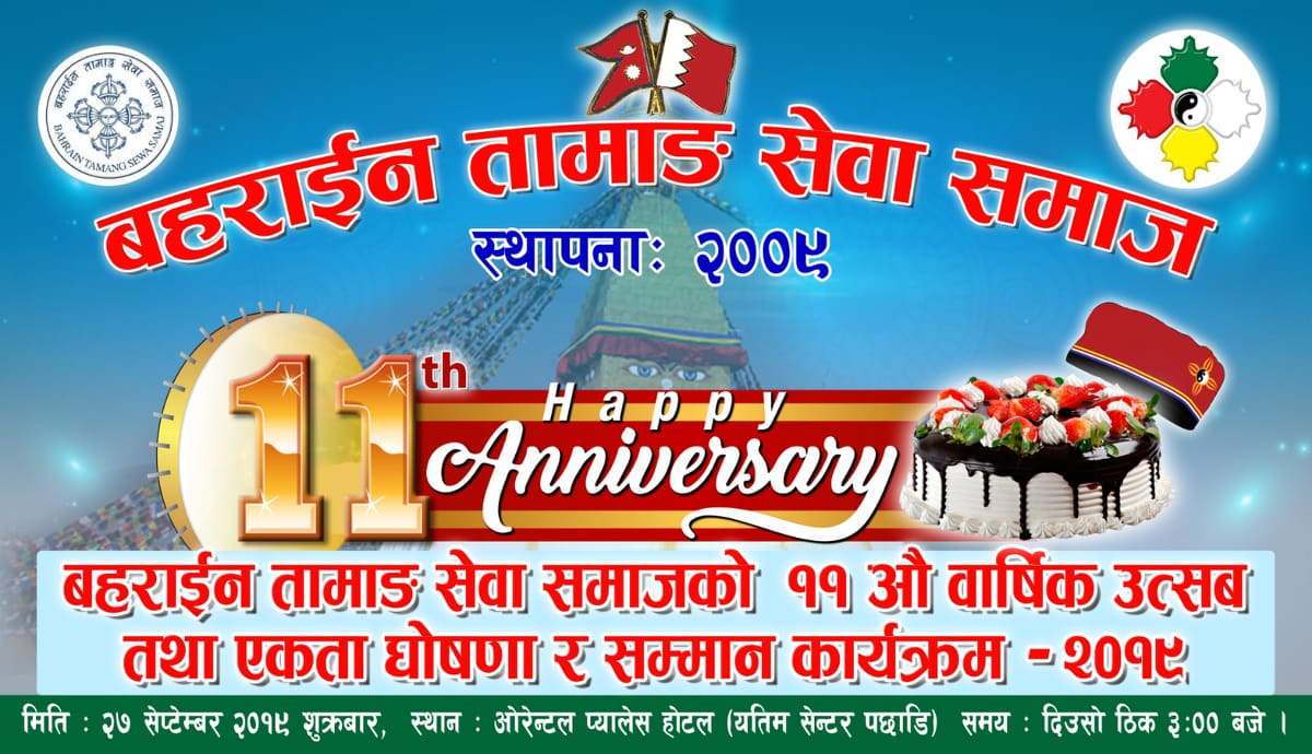 मानमा बहराइन । प्रवास भुमिमा रहि आफ्नो भाषा, धर्म, कला र संस्कार संस्कृतिलाई संरक्षण सम्बद्र्धनमा महत्वपूर्ण भूमिका खेल्दै आएका बहराइन तामाङ सेवा समाजले आफ्नो ११ औं वार्षिकोत्सव मनाउने भएको भएको छ । भाषा, धर्म, कला र संस्कार संस्कृतिलाई संरक्षण सम्बद्र्धनको साथमा सामाजिक कार्य समेत गर्ने उद्देश्यले २००९ मा स्थापना भएको यस संस्थाले १० वर्ष पूरा भई ११ बर्षमा प्रवेश गरेको अवरमा वार्षिकोत्सव कार्यक्रमको आयोजना गरिएको हो ।