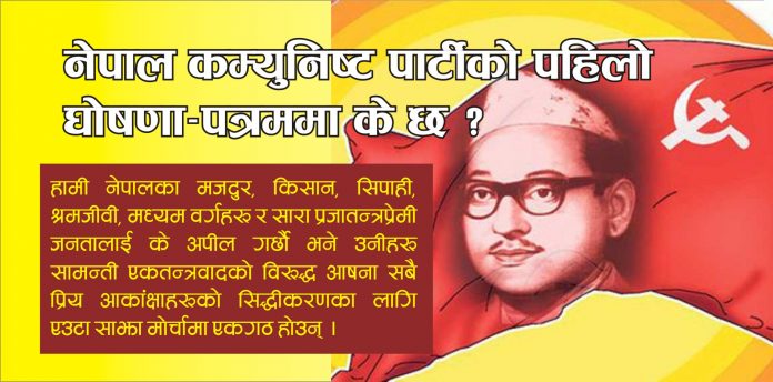 अतः नेपाल कम्युनिस्ट पार्टी श्रमजीवी जनताको विकासशील संघर्षमा सहभागी बन्ने र त्यसलाई संगठित पार्ने तथा नेतृत्व दिने र त्यसलाई विजयसम्म अघि बढाउने काममा आफूलाई समर्पित गर्दछ । यसलाई सो बाटोबाट जस्तासुकै आतङ्क वा झुठो प्रचारले विचलित पार्नसक्ने छैन । अन्य पुँजीवादी तथा निम्नपुँजीवादी पार्टीहरूले पहिले जनताप्रति विश्वासघात गरेका छन् र पछि पनि गर्दै रहने छन् । नेपाल कम्युनिस्ट पार्टी, मार्क्सवाद-लेनिनवादको मार्गदर्शनमा अघि बढेको पार्टीले आँधीबेहरीमा जनताको साथ दिनेछ र यसले के प्रतिज्ञा गर्छ भने यसले सच्चा स्वतन्त्रा तथा लोकजनवादका लागि संघर्षको अघिल्लो पंक्तिमा सदा अडिग भई लडिरहने छ । नेपाल कम्युनिस्ट पार्टी शोषकहरूलाई ठो’क्ने जनताको मुड्की हो । तसर्थ हामी मजदुर वर्ग, भूमिहीन तथा गरिब किसानहरूका सर्वोत्तम छोराछोरीहरूलाई र जनवादी विद्यार्थी, युवा तथा महिलाहरूलाई नेपाल कम्युनिस्ट पार्टीका जुझारू पंक्तिहरूमा सामेल हुन आह्वान गर्दछौँ किनभने एउटा बलियो, जन आधारित कम्युनिस्ट पार्टीले मात्र जनताको लोकजनवादी क्रान्तिकलाई सक्षम नेतृत्व प्रदान गरी विजयसम्म अघि बढाउन सक्दछ ।