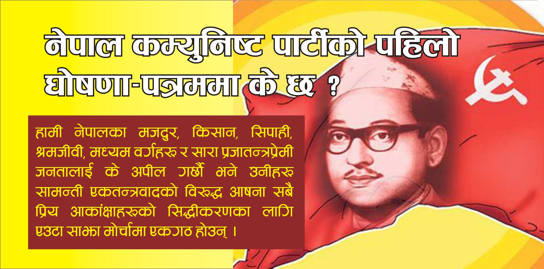 हामी नेपालका मजदुर, किसान, सिपाही, श्रमजीवी, मध्यम वर्गहरू र सारा प्रजातन्त्रप्रेमी जनतालाई के अपील गर्छौ भने उनीहरू सामन्ती एकतन्त्रवादको विरूद्ध आफ्ना सबै प्रिय आकांक्षाहरूको सिद्धीकरणका लागि एउटा साझा मोर्चामा एकगठ होउन् । हामीलाई के कुरामा पूर्ण विश्वास छ भने जनवादी शक्तिहरू तलको जनवादी कार्यक्रमको आधारमा ठोस रूपले एकगठ हुन सक्छन्:-
