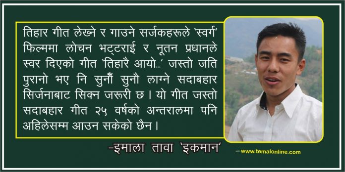 तिहार गीत लेख्ने र गाउने सर्जकह?ले ‘स्वर्ग’ फिल्ममा लोचन भट्टराई र नूतन प्रधानले स्वर दिएको गीत ‘ तिहारै आयो…’ जस्तो जति पुरानो भए नि सुनौँ सुनौ लाग्ने सदाबहार सिर्जनाबाट सिक्न ज?री छ । यो गीत जस्तो सदाबहार गीत २५ वर्षको अन्तरालमा पनि अहिलेसम्म आउन सकेको छैन । गीतलाई कति आयु दिने भन्नु कुरा सर्जकह?को हातमा निर्भर हुने हुँदा गीत नै बनाए सकेपछि अलि समयसम्म आयु रहने गीत बनाउन तर्फ सर्जकह? लाग्नु पर्छ । क्षणिक चर्चा र फाईदाको हिसाबले मात्रै गीत संगीतलाई हेर्नु हुदैन । यसपालिको तिहारको अवसर पारेर रामकृष्ण ढकालको स्वरमा रमेश बिजीको गीत ‘टीकामाला’ ले भने बाध्यता तथा कारणबस टाढा भएको चेली–माइतीबीचको गहिरो सम्बन्धलाई देखाउन खोजिएको छ । यो सकरात्मक पाटो हो । ‘टिकामाला’ले थोरै भए पनि सदाबहार गीतको लय समातेको छ । न्याय गरेको छ । पछिल्लो समयमा बजारमा आयो अधिकांश गीतह? हेर्दा तिहारका गीतह?मा हुने लय, तिहार के हो भन्ने बारेमा पनि कम अध्ययन अनुसन्धान भएको र ज्ञान हुने सर्जकह? पनि त्यतातिर ध्यान दिन नचाहेको स्पष्ट देखिन्छन् । मलाई कुनै समय पर्व र लोक संस्कृतिका गीतलाई शम्भु राई र बम बहादुर कार्कीजस्ता अग्रजले गरेको राम्रो कामबाट नयाँ पुस्ताले सिक्न नसकेको जस्तो लाग्छ । सबै पुस्तालाई समेट्ने कोसिस गर्नुपर्छ । त्यसमा आधुनिक प्रयोग हुन ज?री छ । तर मौलिक संस्कृतिलाई भने चटक्कै विर्सनु हुदैन भन्ने हो । अबको दिनमा हरेक स्रष्टाले सदाबहार सिर्जना दिनेतिर पनि सोच्नुपर्छ ।