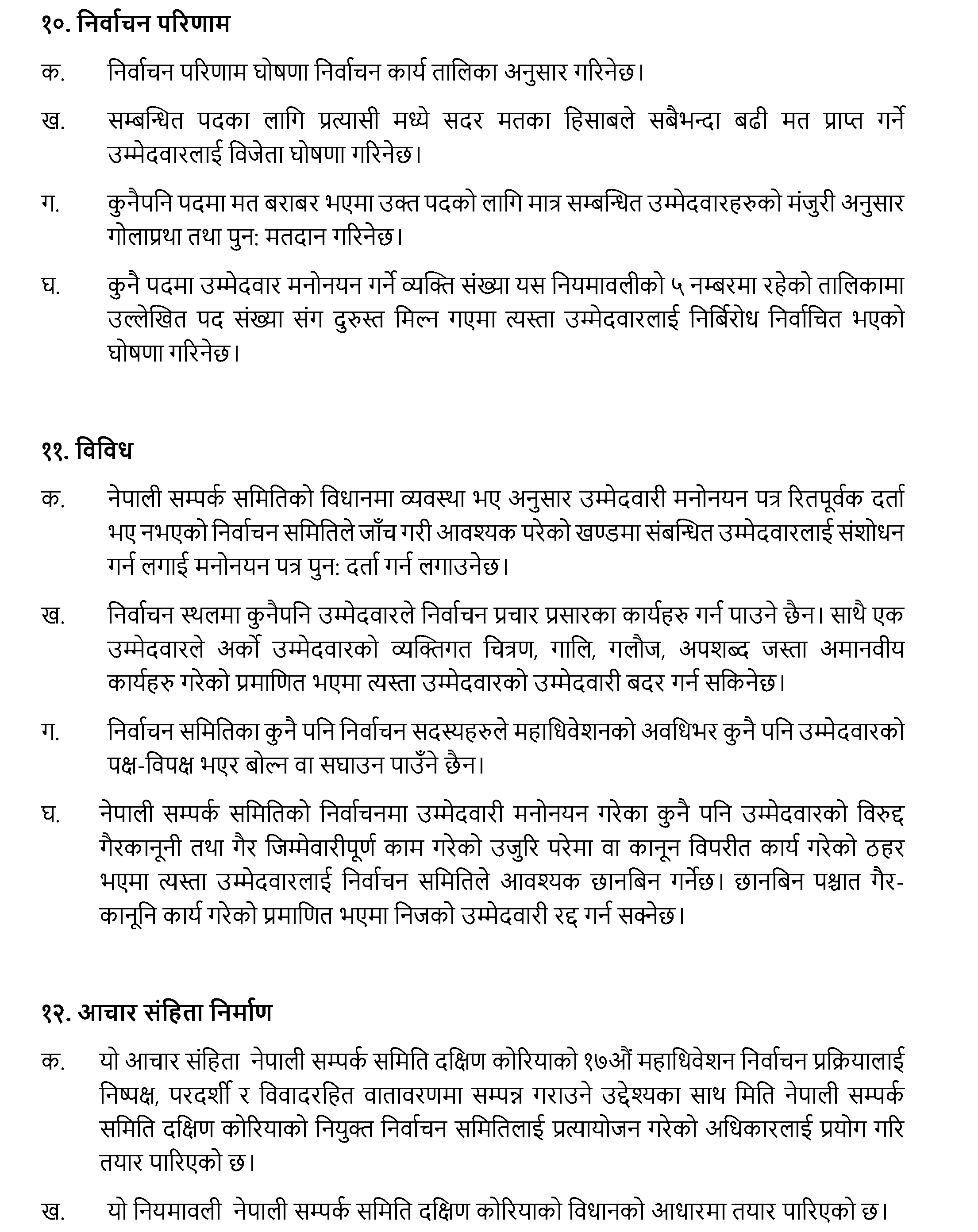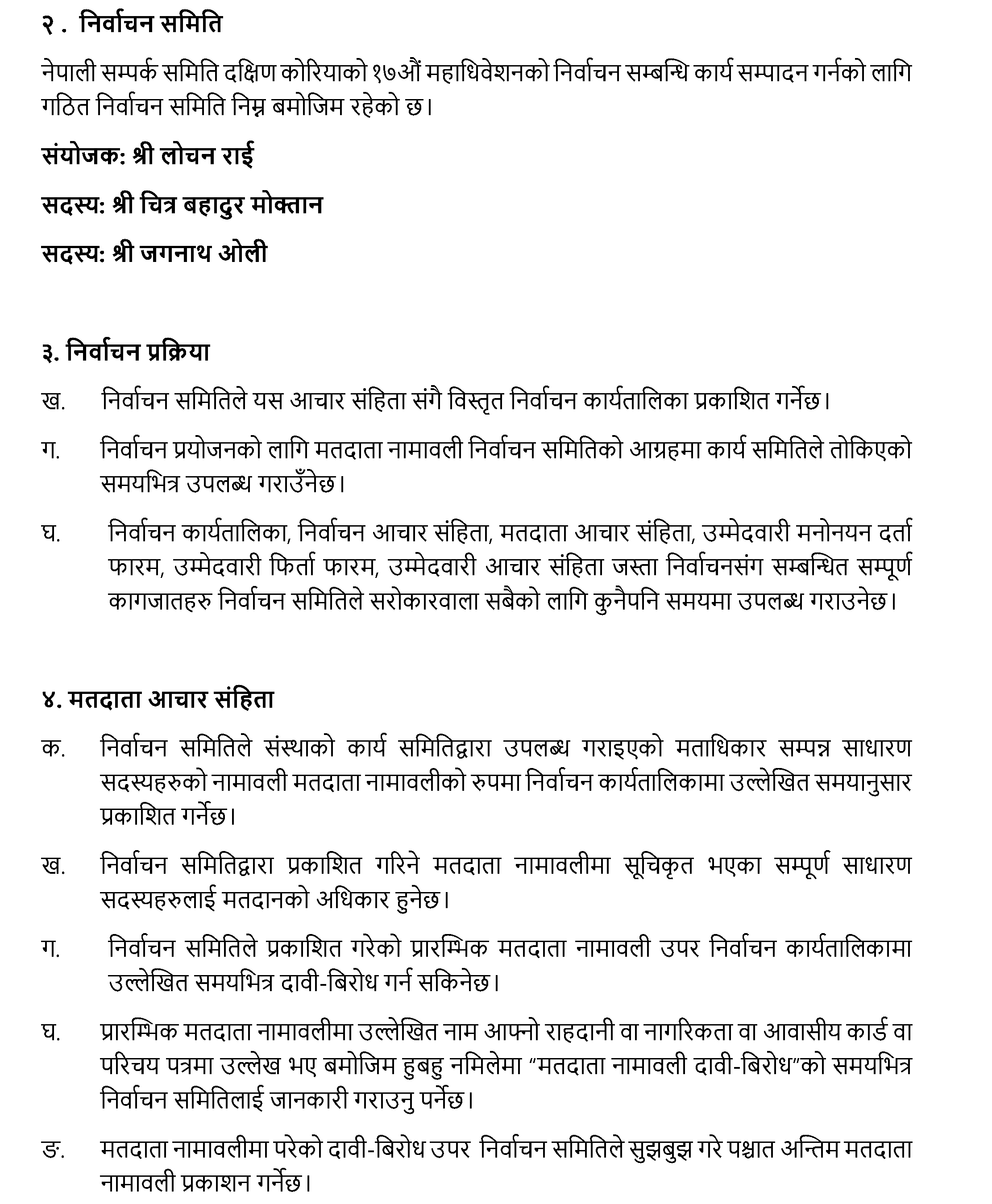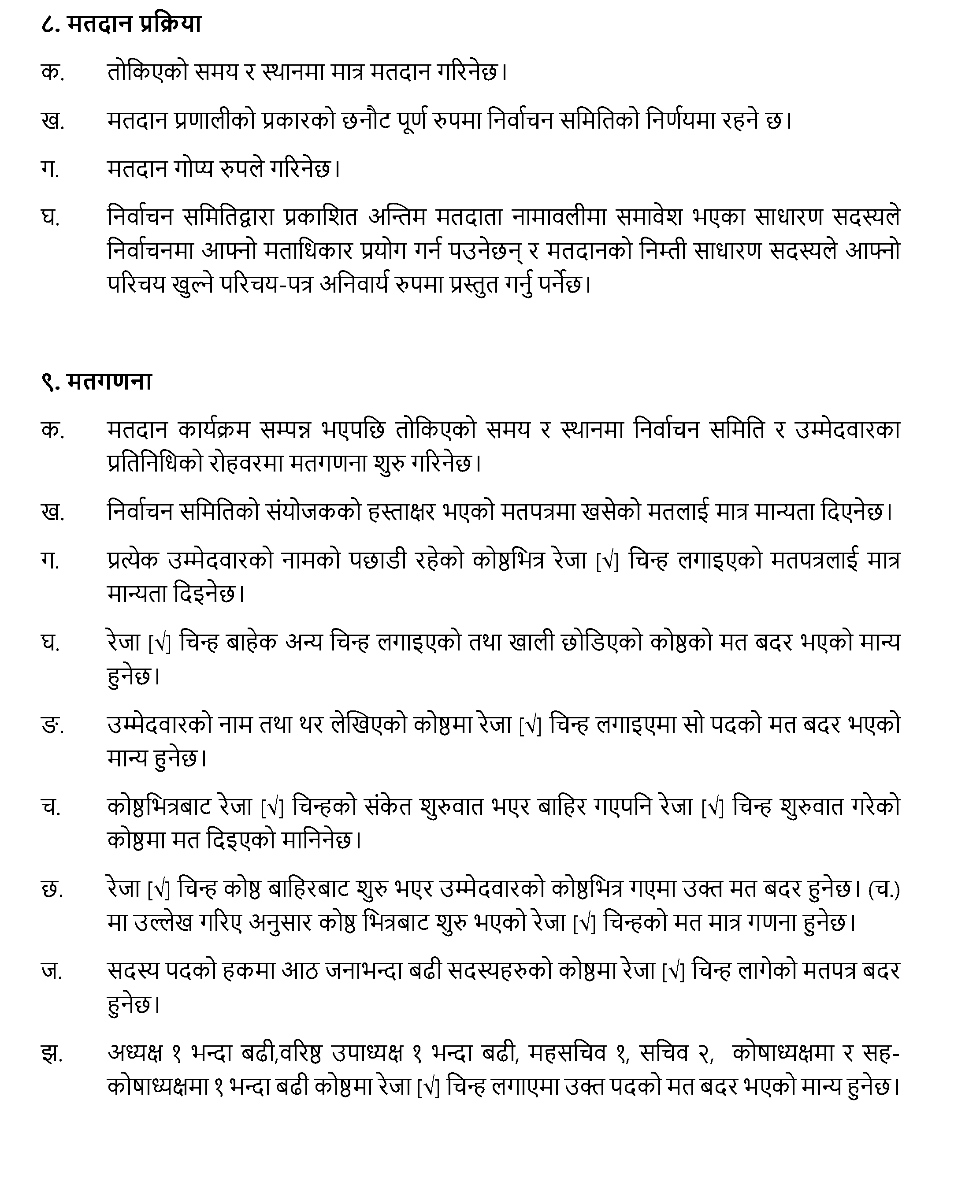 साथै निर्वाचन आचारसंहितासहितः निर्वाचन हुने पद, उम्मेदवारी मनोनयन दर्ता शुल्क, उम्मेदवार हुन आवश्यक योग्यता, उम्मेदवारी मनोनयन दर्ता प्रकृया, मतदान प्रकृया, मतगणना, निर्वाचन परिणाम, निर्वाचन कार्यतालिकालाइ प्रकाशित गरेको निर्वाचन समितिका सदस्य चित्र बहादुर मोक्तानले जानकारी दिनुभयो ।