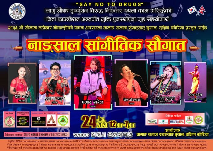 गीत–संगीतको भिन्न–भिन्न विधालाइ समेट्ने गरि निमन्त्रणा गर्न लागिएको उक्त मनोरञ्जनात्मक सांगीतिक कार्यक्रमलाई सभ्य, भब्य अनि ऐतिहासिक रुपमा सफल पार्न उक्त दिन यस ख्यङ्साङ् बुसान क्षेत्रमा कुनै पनि कार्यक्रम नजुदाइ दिनहुनसमेत अध्यक्ष घिसिङले अग्रह गर्नुभयो ।