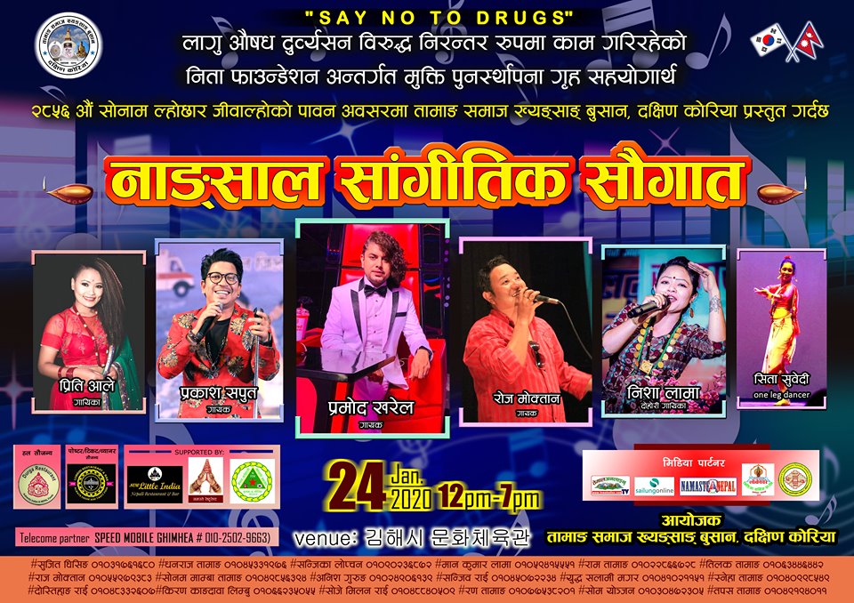 यस ‘नाङ्साल सांगीतिक सौगात’ कार्यक्रमलाई आर्थिक, भौतिक, नैतिक सहयोग गरिदिन हुन कोरियाबासी सम्पुर्ण नेपालीहरुलाई ख्याङ्सङ तामाङ समाज दक्षिण कोरियाका महासचिब सोम योन्जनले अपिल गर्नुभयो ।