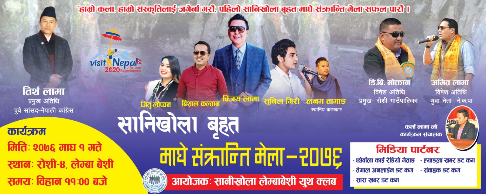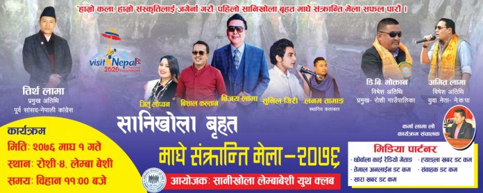 सानिखोला लेम्बा बेशी युथ क्लबको अायोजनामा एतिहासिक धार्मिक तिर्थ स्थल गुप्तेश्वर महादेवको संरक्षण तथा प्रवर्द्धन गर्ने उदेश्यले ईतिहास मै पहिलो पटक हुने बृहत सानीखोला माघे संक्रान्ति मेलामा पुर्व सांसद माननीय तिर्थ लामाको प्रमुख अातिथ्यतामा मागे संक्रान्ति मेला तथा बृहत साँस्कृतिक कार्यक्रम २०७६ को उद्घाटन गरिने युथ क्लबका अध्यक्ष निर्मल लामाले जानकारी दिएका छन् ।