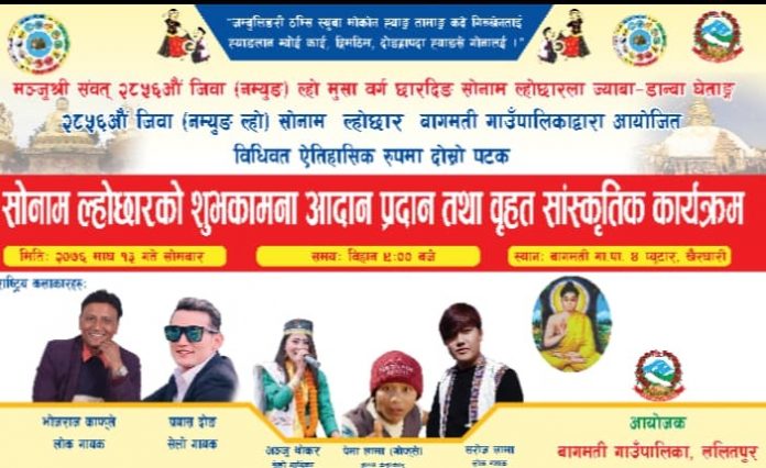 ललितपुर । तामाङ समुदायको ऐतिहासिक राष्ट्रिय पर्व २८५६ जिवा ल्हो (मुसा) वर्षको अवसरमा दोस्रो पटक बागमती गाँउपालिकाले गाँउपालिका स्तरीय बृहत सोनाम ल्होछार कार्यक्रम हुने भएको छ । कार्यक्रम आगामी माघ १३ गते एक दिनको विदा दिई बागमती गाउँ पालीकाको वडा नं ४ प्युटारको खयरघारी खेलकुद मैदानमा हुनेभएको हो ।