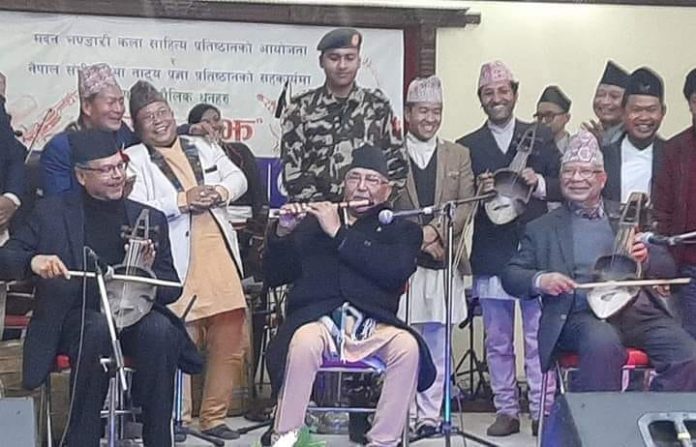 काठमाडौं । प्रधानमन्त्री केपी शर्मा ओलीले ‘सारङ्गी र बाँसुरी बजाएका छन् । मंगलबार ‘सारङ्गी साँझ’ कार्यक्रममा सहभागी भएका हुन् । प्रधानमन्त्री निवास बालुवाटारमा मदन भण्डारी कला साहित्य प्रतिष्ठान र नेपाल सङ्गीत तथा नाट्य प्रज्ञा प्रतिष्ठानको सहकार्यमा आयोजित नेपाली मौलिक बाजा र धुनहरुको ‘सारङ्गी साँझ’ मा उनी सहभागी भएका थिए ।