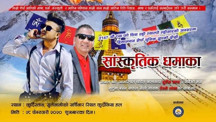 साँस्कृतिक धमाका फेब्रुअरी २८ तारिखका दिन हिमालयन शेर्पा युनिक ग्रुपको आयोजनामा हुने उक्त धमाका कुर्दिस्तानस्थित सुलेमानि सर्चिनारको कुर्दानिया हलमा हुने ग्रुपका अध्यक्ष ठूलोकान्छा शेर्पाले तेमाल अनलाईनलाई जानकारी दिए ।