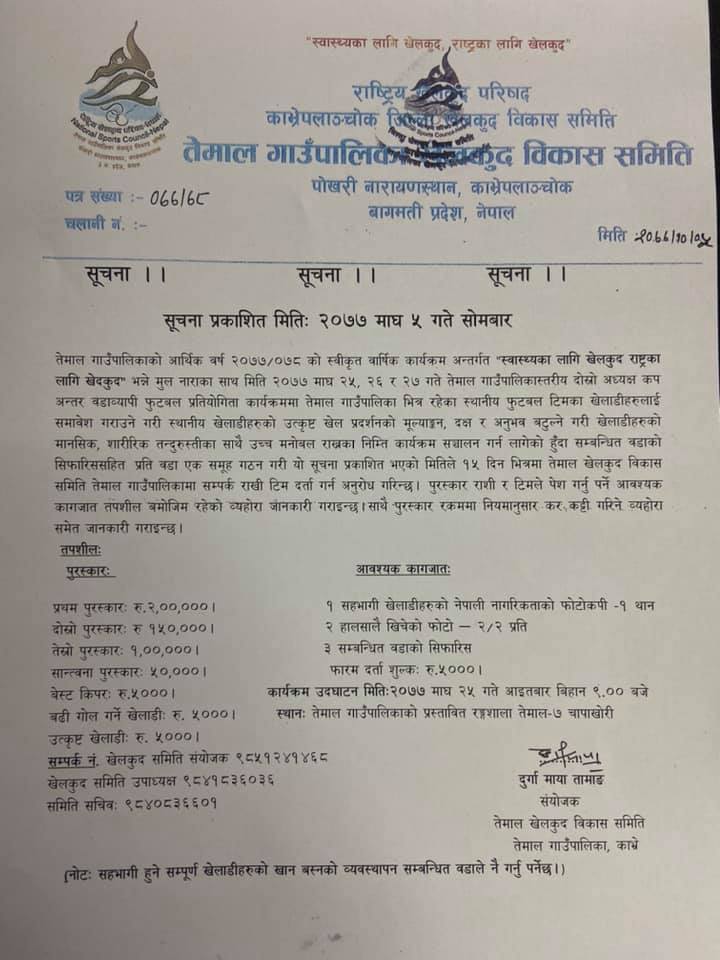तेमाल खेलकुद विकास समितिका संयोजक तथा गाउँपालिका उपाध्यक्ष दुर्गामाया तामाङका अनुसार तेमाल गाउँपालिकाको आर्थिक वर्ष २०७७।०७८ को स्वीकृत वार्षिक कार्यक्रम अन्तर्गत प्रतियोगिता हुन लागेको हो । प्रतियोगिता कार्यक्रममा तेमाल गाउँपालिका भित्र रहेका स्थानीय फुटवल टिमका खेलाडीहरुलाई समावेश गराउने उपाध्यक्ष तामाङले बताइन् । ‘स्थानीय खेलाडीहरुको उत्कृष्ट खेल प्रदर्शनको मुल्यांकन, दक्ष र अनुभव बटुल्ने गरी खेलाडीहरुको मानसिक, शारीरिक अन्तुरुस्तीका साथ उच्च मनोबल राख्नका निम्ति कार्यक्रम सञ्चालन गर्न लागेका हौं ।’ उनले भनिन्, ‘हामीले गत वर्षभन्दा व्यवस्थित र मर्यादित बनाउन लागेका छौं ।’