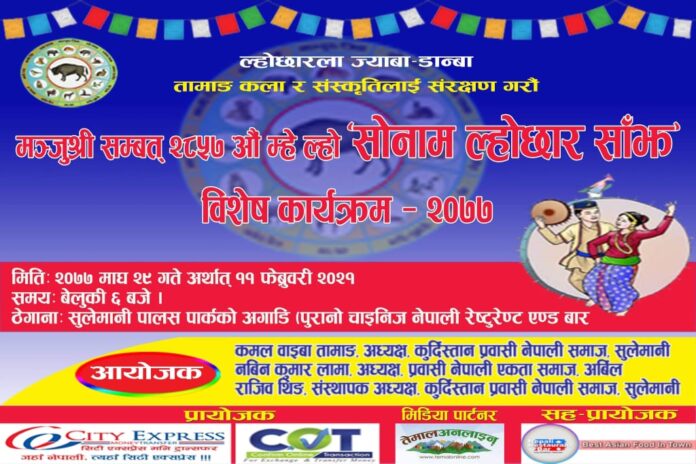 इराक । विभिन्न कामको सिलसिलामा इराक पुगेका नेपालीहरुले २८५७ लङ (म्हे) सोनाम ल्होछारको अवसरमा विशेष कार्यक्रमको आयोजना गरिएको छ । आफ्नो मौलिकता र सँस्कृतिलाई सम्बद्र्धन र विकासको लागि भन्दै “२८५७ लङ ल्हो सोनाम ल्होछार साँझ“ विशेष कार्यक्रमको आयोजना गरिएको हो ।