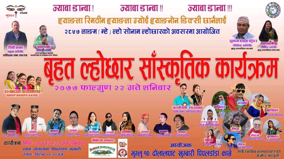 भन्ने मुल नाराका साथ भुम्लु १०,दोलालघाट खुमबारी पिपलडाँडा काभ्रेद्वारा आयोजित ल्होछार कार्यक्रम पुर्व माननीय तिर्थ लामाको प्रमुख आतिथ्यतमा हुने भएको छ।