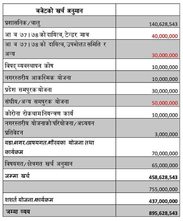 आगामी आर्थिक बर्ष ०७८/७९ मा केन्द्र, प्रदेश सरकार एवं पाँचखाल नगरपालिकाको कुल 895,628, 543 अक्षेरुपी रुपैयाँ) ८९ करोड ५६ लाख २८ हजार ५४३ मात्र | ) व्यय हुने अनुमान गरेको छ । जसमध्ये चालु खर्च १४ करोड ६ लाख २८ हजार ५४३ र पुँजीगत तर्फ ७५ करोड ५० लाख रुपैंया विनियोजन गरेको छु ।