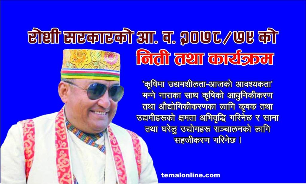 १७. “कृषिमा उद्यमशीलता – आजको आवश्यकता” भन्ने नाराका साथ कृषिको आधुनिकीकरण तथा औद्योगिकीकरणका लागि कृषक तथा उद्यमीहरुको क्षमता अभिवृद्धि गरिनेछ र साना तथा घरेलु उद्योगहरु सञ्चालनको लागि सहजीकरण गरिनेछ।