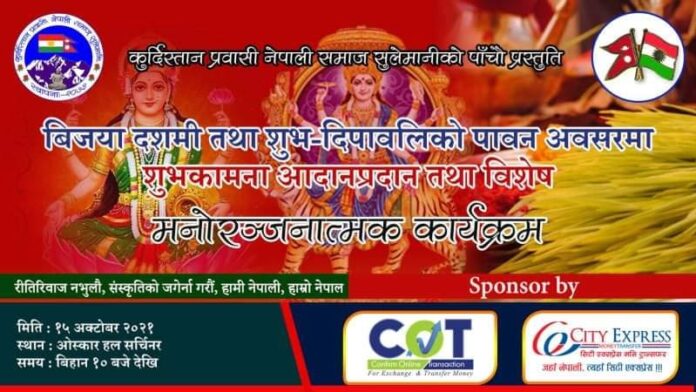 रोजगारको सिलसिलमा इराकमा रहेको नेपालीहरुले मनोरञ्जनात्मक कार्यक्रमको आयोजना गरिएको छ । विजय दशमी तथा शुभ दिपावलीको अवसरमा उक्त कार्यक्रमको आयोजना गरिएको कार्यक्रम संयोजक इन्द्र श्रेष्ठले जानकारी दिएका छन् ।