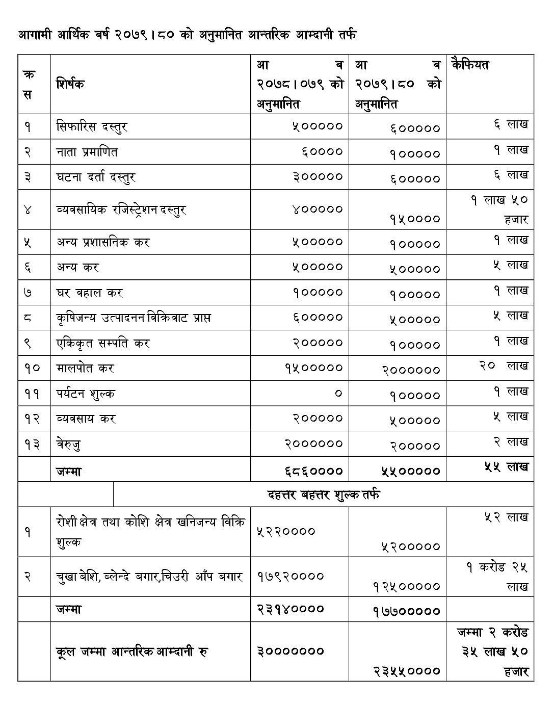 ५. अब म यिनै चुनौती, उद्देश्य र प्रथमिकताको आधारमा तयार गरिएको आगामी आर्थिक वर्ष २०७९।८० को कूल राजश्व, आय र व्ययको अनुमानित विवरण यस गरिमामय सभा समक्ष प्रस्तुत गर्ने अनुमति चाहन्छु ।