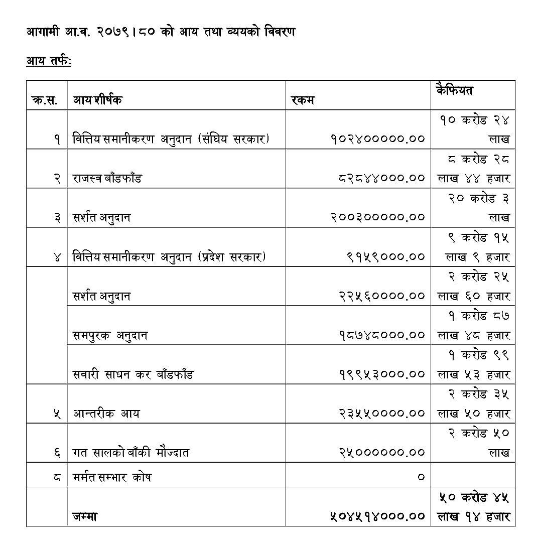 १.गाउँपालिकाको सम्मानित एघारौं गाउँसभा समक्ष गाउँपालिको भाविसोच एवं जनआकांक्षा समेटिएको आर्थिक वर्ष २०७९।८० को समग्र नितिलाई कार्यक्रम मार्फत कार्यान्वयनमा ल्याउन दस्तवेजको रुपमा बजेट प्रस्तुत गरिरहँदा मैले अत्यन्तै गर्वको महसुस गरेको छु । आर्थिक वर्ष २०७९।८० को बजेटले गाउँपालिकाको सामाजिक, आर्थिक, रोगजार र दिगो तथा वातावरणमैत्री पूर्वाधार विकासमा रणनैतिक महत्व राख्ने अपेक्षा राखेको छ । यस महत्वपूर्ण अवसरमा नेपालको राजनितिक परिवर्तनमा जीवन बलिदान गर्नुहुने सम्पूर्ण ज्ञातअज्ञात शहिदहरु प्रति भावपूर्ण श्रद्धञ्जली व्यक्त गर्दछु ।