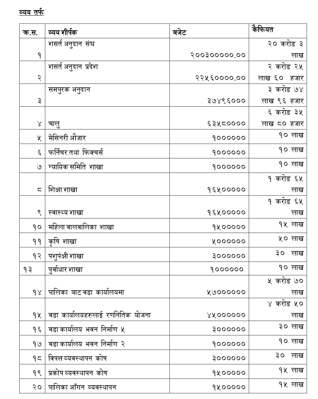 प्रस्तुत बजेट तर्जुमा गर्ने प्रक्रियामा प्रत्यक्ष तथा परोक्षरुपमा सहयोग पुर्याउनुहुने गाउँसभा प्रमुखज्यू, कार्यपालिका सदस्यज्यू, गाउँसभा सदस्यज्यू, विज्ञ महानुभाव, राजनीतिक दलका प्रतिनिधि एवं राजनीतिज्ञ, सञ्चारजगत्, नागरिक समाज, निजि क्षेत्र एवं विकास सहयात्री लगायत सम्पूर्ण गाउँबासी दाजुभाई तथा दिदिवहिनी तथा अहोरात्र खटिने गाउँपालिकाका सम्पूर्ण कर्मचारी मित्रहरुलाई हार्दिक धन्यवाद ज्ञापन गर्दछु । यसै आय र क्षेत्रगत व्यय समेटिएको रातो पुस्तिका शिघ्र सार्वजनिक गरिने व्यहोरा यस सम्मनित गाउँसभा समक्ष जानकारी गराउछु ।