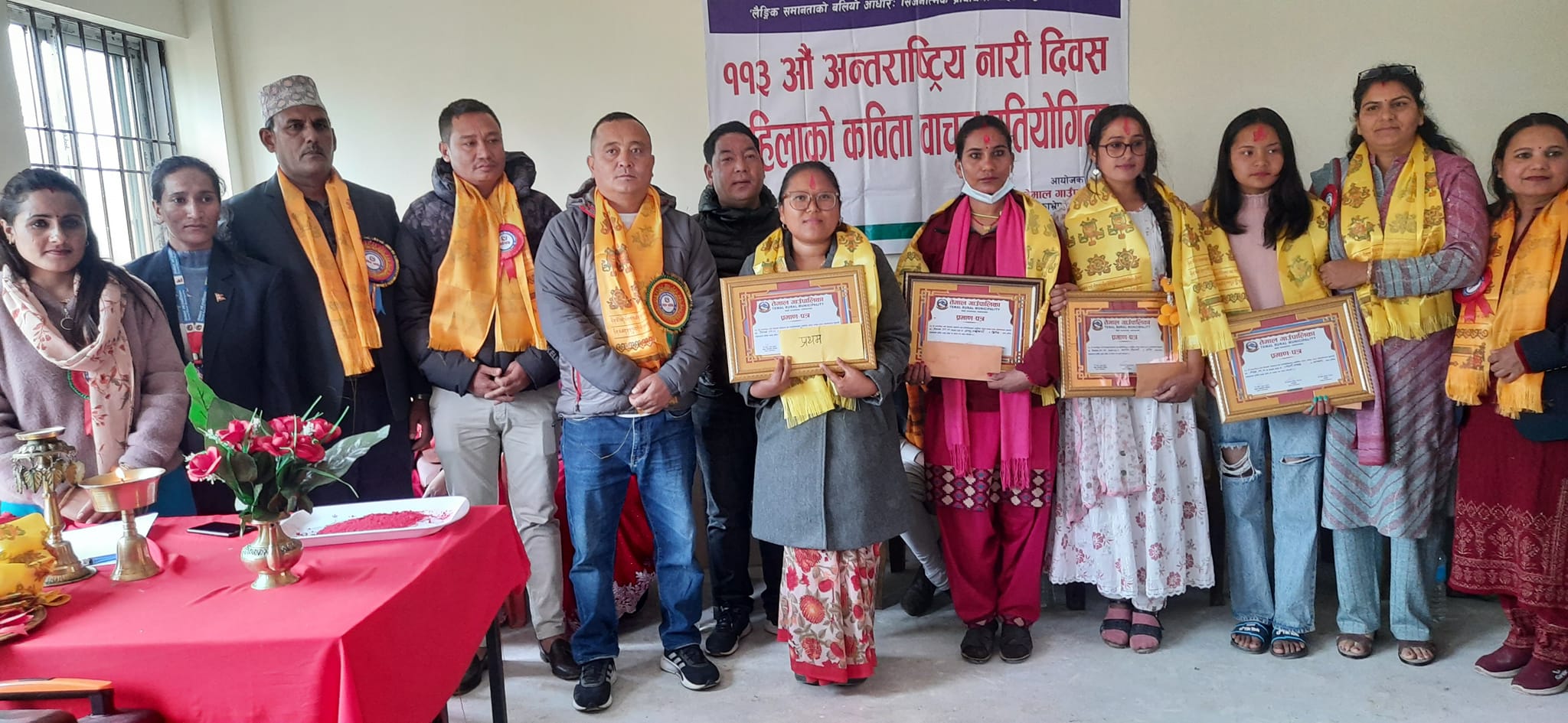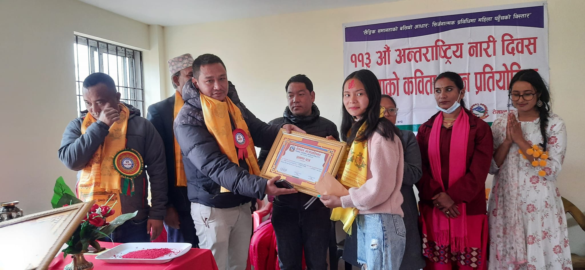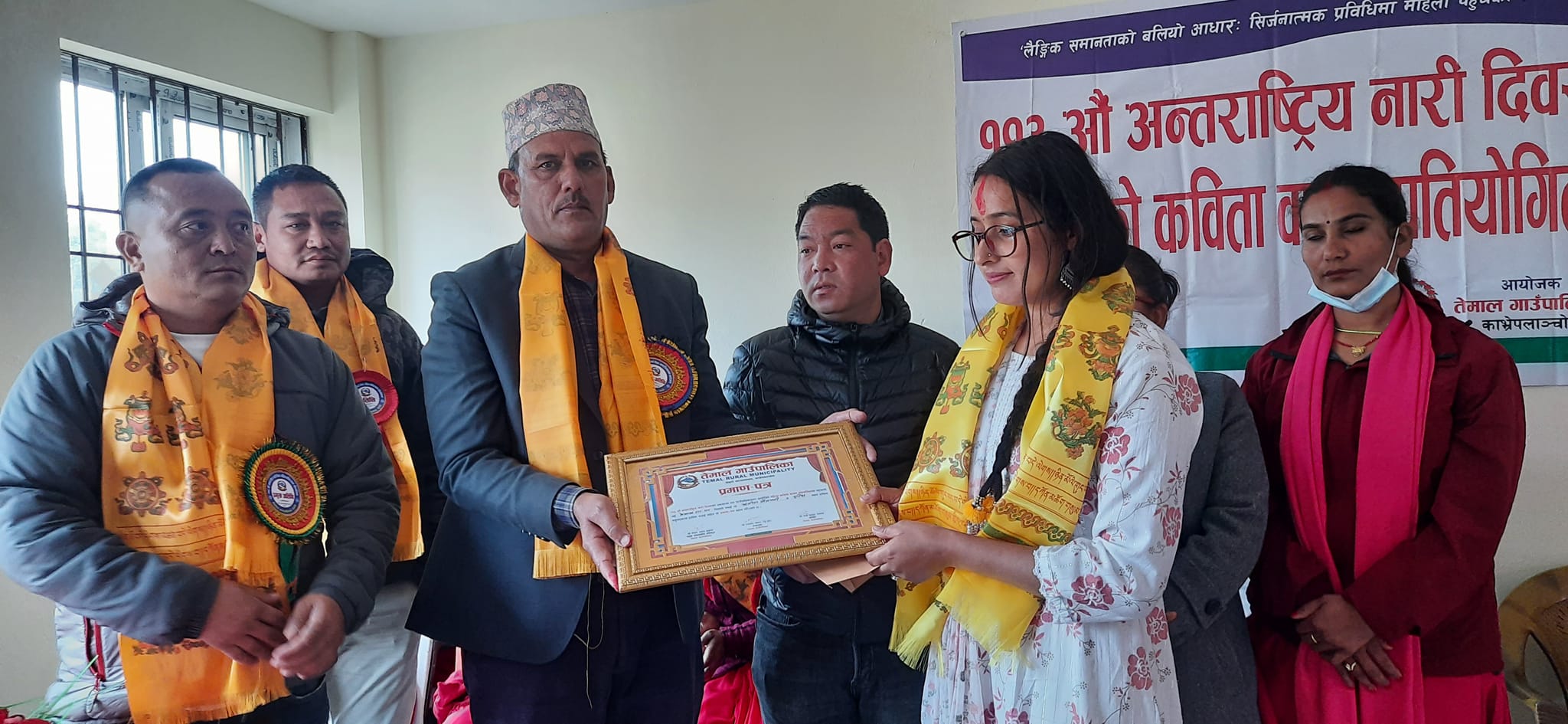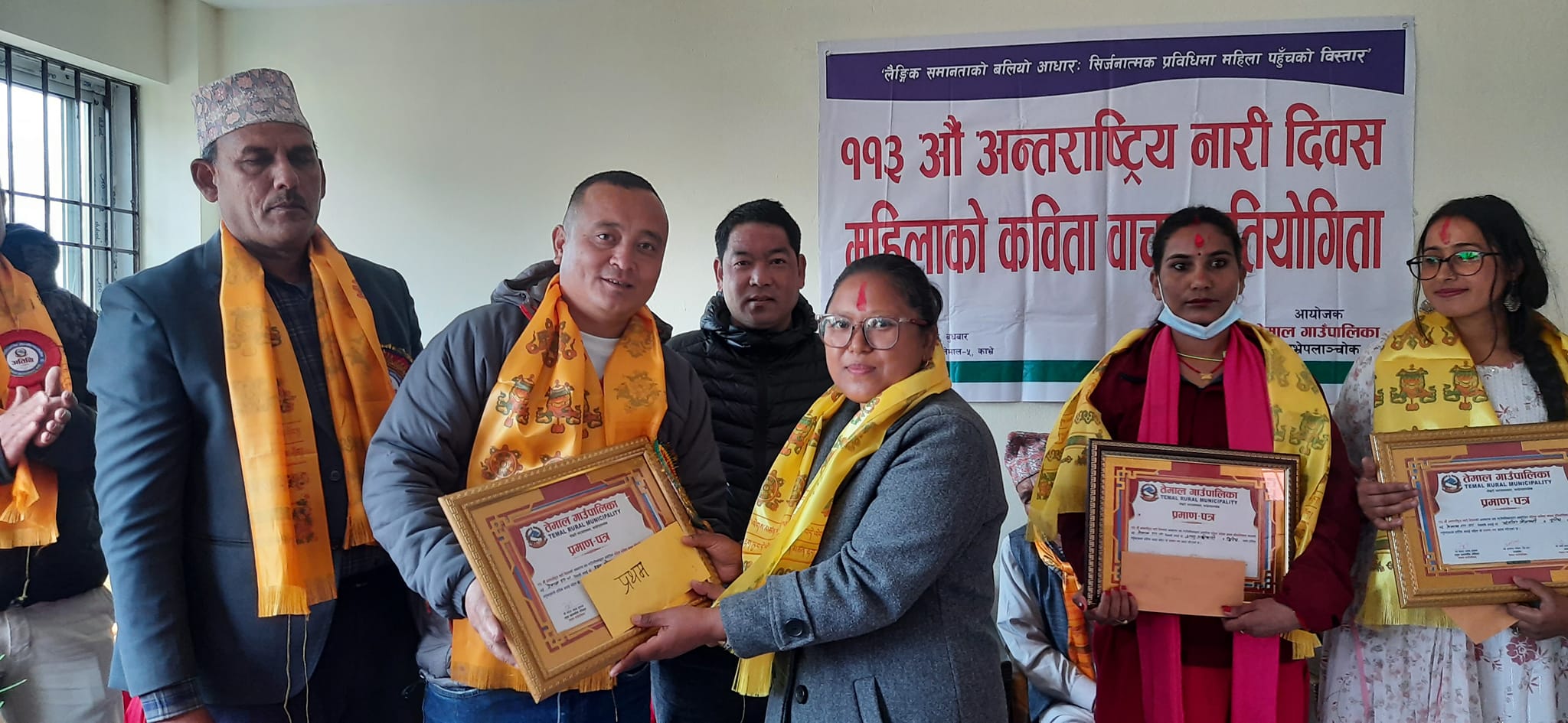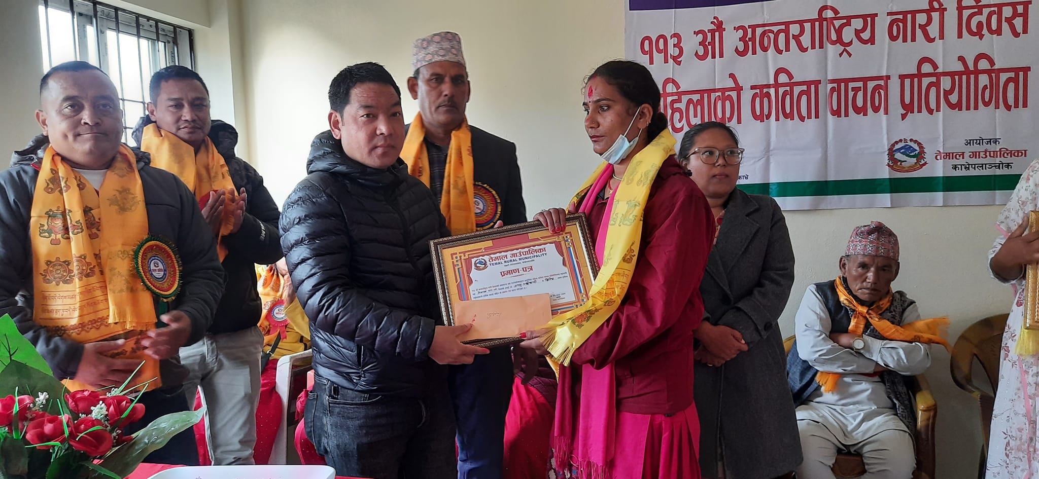 काभ्रे जिल्लाको तेमाल गाउँपालिकामा ११३ औं अन्तराष्ट्रिय श्रमिक महिला दिवसको अवसरमा कविता प्रतियोता सम्पन्न भएको छ । बुधबार ‘लैङ्गकि समानताको बलियो आधार, सिर्जनात्मक प्रविधिमा महिला पहुँचको विस्तार’ मूल नाराका साथ कार्यक्रम सम्पन्न भएको हो ।