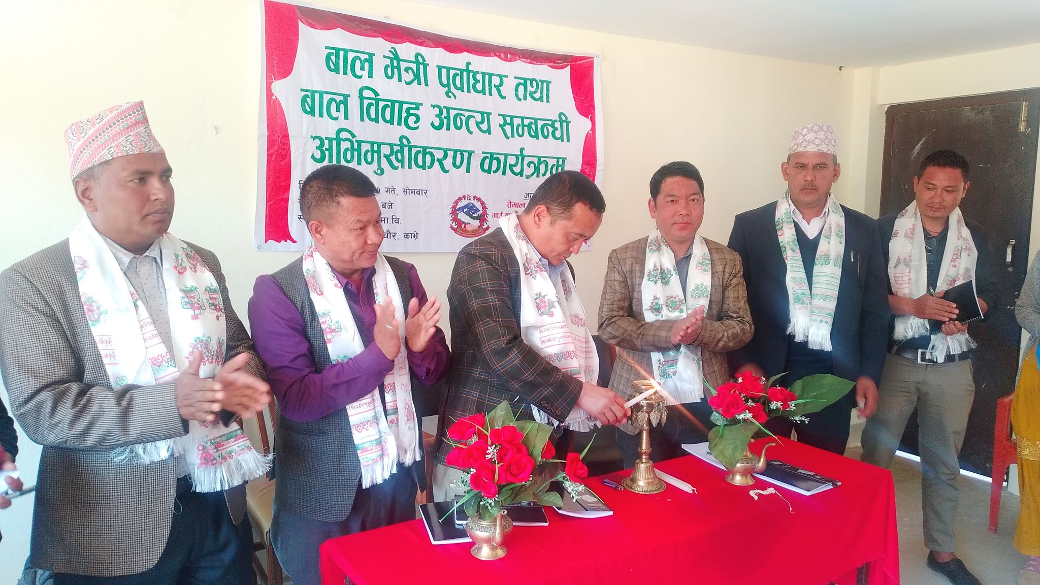 काभ्रे जिल्लाको तेमाल गाउँपालिकामा ‘बालमैत्री पूर्बाधार तथा बालबिबाह सम्बन्धि अभिमुखिकरण कार्यक्रम’ सम्पन्न भएको छ । सोमबार सम्पन्न कार्यक्रम उपाध्यक्ष दलमान थोकरको अध्यक्षतामा र गाउँपालिका अध्यक्ष चन्द्रबहादुर तामाङको प्रमुख आतिथ्यतामा सम्पन्न भएको थियो ।