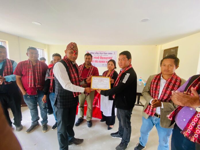 नयाँ स्थायी शिक्षकहरुलाई प्रमुख अतिथि तथा गाउँपालिका उपाध्यक्ष थोकरले सम्मान पत्र वितरण गरेका थिए ।