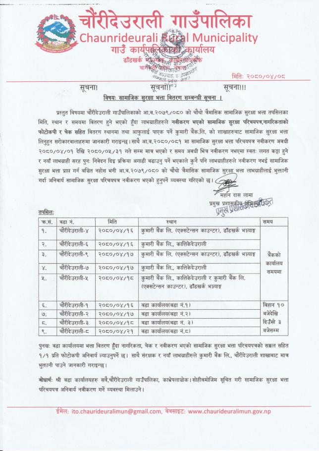 गाउँपालिकाको प्रमुख प्रशासकीय अधिकृत महानदास लामाले एक सूचना जारी गर्दै साउन १६ गतेदेखि साउन २१ गतेसम्म सामाजिक सुरक्षा भत्ता वितरण गर्ने जनाएको छ । आ.व. २०७९/०८० को चौथो त्रैमासिक सामाजिक सुरक्षा भत्ता वडा–वडामा पुगेर लाभग्राहीलाई भुक्तानी दिने उनले जारी गरेको सूचनामा जनाएको छ ।