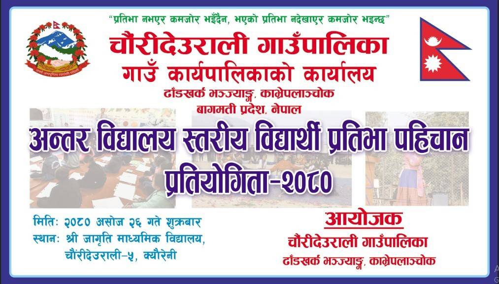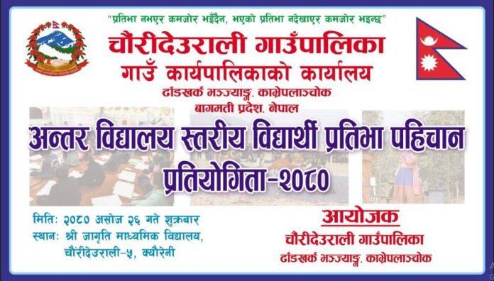 चौंरीदेउराली– काभ्रे जिल्लाको चौंरीदेउराली गाउँपालिकामा अन्तर विद्यालय स्तरीय विद्यार्थी प्रतिभा पहिचान प्रतियोगिता–२०८० हुने भएको छ ।