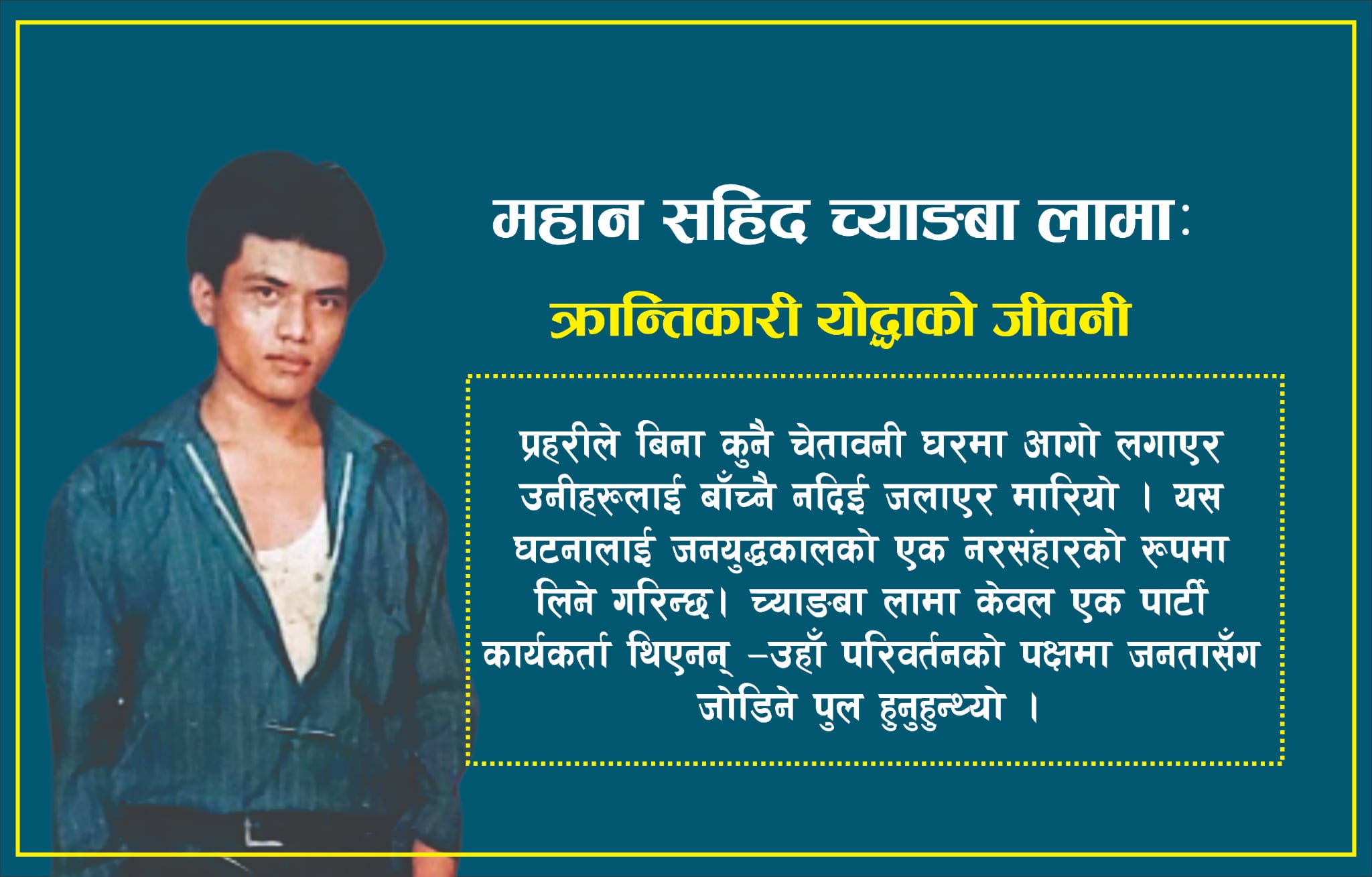नेपालको इतिहासमा त्यस्ता थुप्रै व्यक्तित्वहरू छन्, जसले व्यक्तिगत सुख–सुविधाको परवाह नगरी जनताको मुक्तिको लागि जीवन समर्पण गरे । ती मध्ये एक अमर नाम हो—सहिद च्याङबा लामा । उहाँले नेपाली समाजको अन्याय, अत्याचार र दमनको विरुद्ध आवाज उठाउन न केवल राजनीति र सामाजिक अभियानलाई माध्यम बनाउनु भयो, तर जनसंघर्षको भावनालाई गीत–संगीत मार्फत जनजनमा पुर्याउनु भयो ।