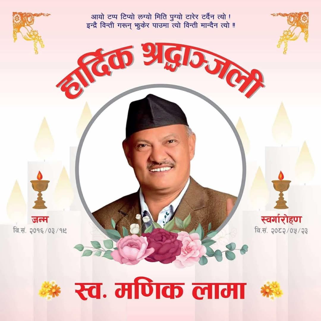 काठमाडौं । क्रान्तिकारी नेता तथा समाजसेवी मणिक लामाको निधन भएको छ। तामाङ चलचित्र क्षेत्रकी नायिका रञ्जिता लामाका पिता समेत रहेका उनको आज स्वयम्भूमा अन्तिम संस्कार हुँदैछ।