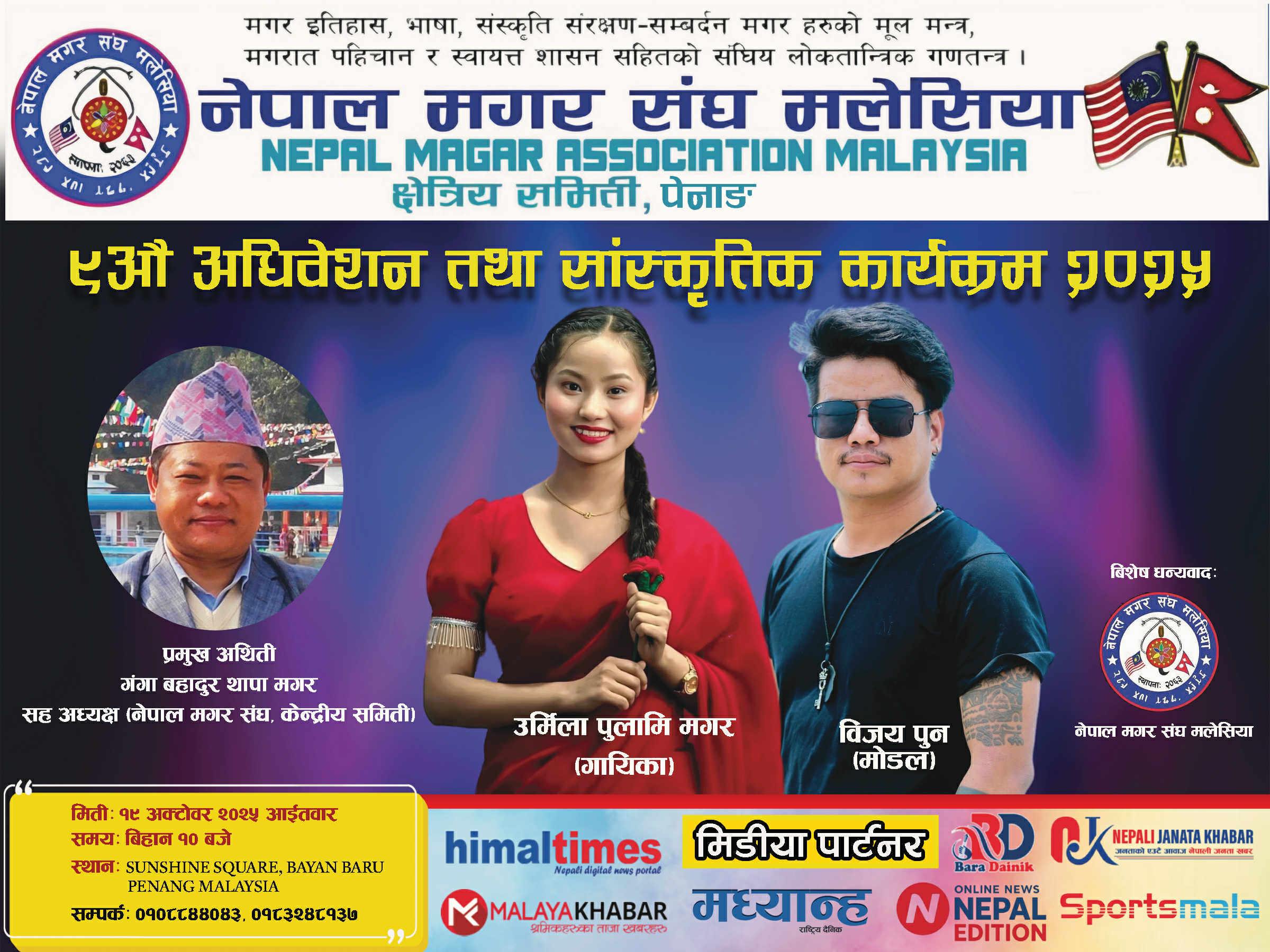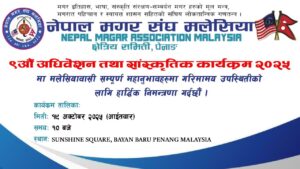 पेनाङ, मलेसिया — नेपाल मगर संघ मलेसिया, क्षेत्रीय समिति पेनाङले आगामी १९ अक्टोबर २०२५ (आईतबार) का दिन ९औं अधिवेशन तथा सांस्कृतिक कार्यक्रम २०८२ भव्य रूपमा आयोजना गर्ने भएको छ। कार्यक्रम बयान बारु, पेनाङस्थित सनसाइन स्क्वायर (Sunshine Square) मा बिहान १० बजे देखि सुरु हुने जानकारी आयोजकले दिएको छ।