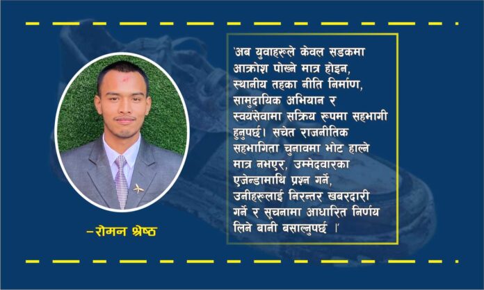 अब युवाहरूले केवल सडकमा आक्रोश पोख्ने मात्र होइन, स्थानीय तहका नीति निर्माण, सामुदायिक अभियान र स्वयंसेवामा सक्रिय रूपमा सहभागी हुनुपर्छ। सचेत राजनीतिक सहभागिता चुनावमा भोट हाल्ने मात्र नभएर, उम्मेदवारका एजेन्डामाथि प्रश्न गर्ने, उनीहरूलाई निरन्तर खबरदारी गर्ने र सूचनामा आधारित निर्णय लिने बानी बसाल्नुपर्छ। प्रविधिको सदुपयोग सामाजिक सञ्जाललाई आक्रोश पोख्ने माध्यम मात्र नबनाई, ज्ञान आर्जन गर्ने, रचनात्मक बहस गर्ने र सामाजिक समस्या समाधानका लागि नवीन उपायहरू खोज्ने मञ्चको रूपमा प्रयोग गर्नुपर्छ |
