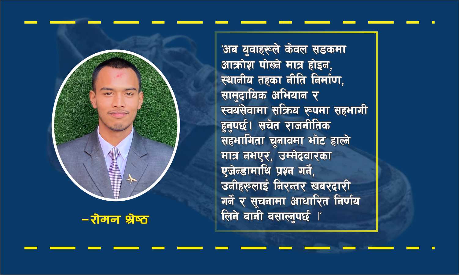 युवाहरूको आक्रोश देशको भविष्यका लागि खतराको घण्टी हो, तर यो अवसरको ढोका पनि हो। यदि राजनीतिक नेतृत्वले यो आक्रोश पछाडिको पीडा र यथार्थलाई बुझेर आफूलाई सुधार्न तयार हुन्छ र युवा पुस्ताले पनि आफ्नो ऊर्जालाई देश निर्माणको रचनात्मक कार्यमा लगाउँछ भने, देशले नयाँ बाटो समात्न सक्छ। नत्र भने, सडकमा भेटिएको त्यो लावारिस जुत्ताजस्तै, देशको भविष्य पनि अलपत्र र दिशाहीन हुनेछ। निर्णय आजको नेतृत्व र युवा पुस्ताको हातमा छ।