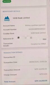 २८ सेप्टेम्बर २०२५ का दिन रोल्पाली सेवा समाज, मलेसियाद्वारा आयोजित दसैं विशेष कार्यक्रमको अवसरमा रोल्पाली सेवा समाज अध्यक्ष :-टिपेन्द्र बुढा मगर , NRNA RC कोषाध्यक्ष तिलक बहादुर श्रेष्ठ, NRNA NCC MALAYSIA अध्यक्ष राकेश प्रसाद महतोको उपस्थितिमा पीडित बालकको बैंक खातामा रु. ४४,८५० (चौवालिस हजार आठ सय पचास रुपैयाँ) आर्थिक सहयोग रकम जम्मा गरिएको हो।