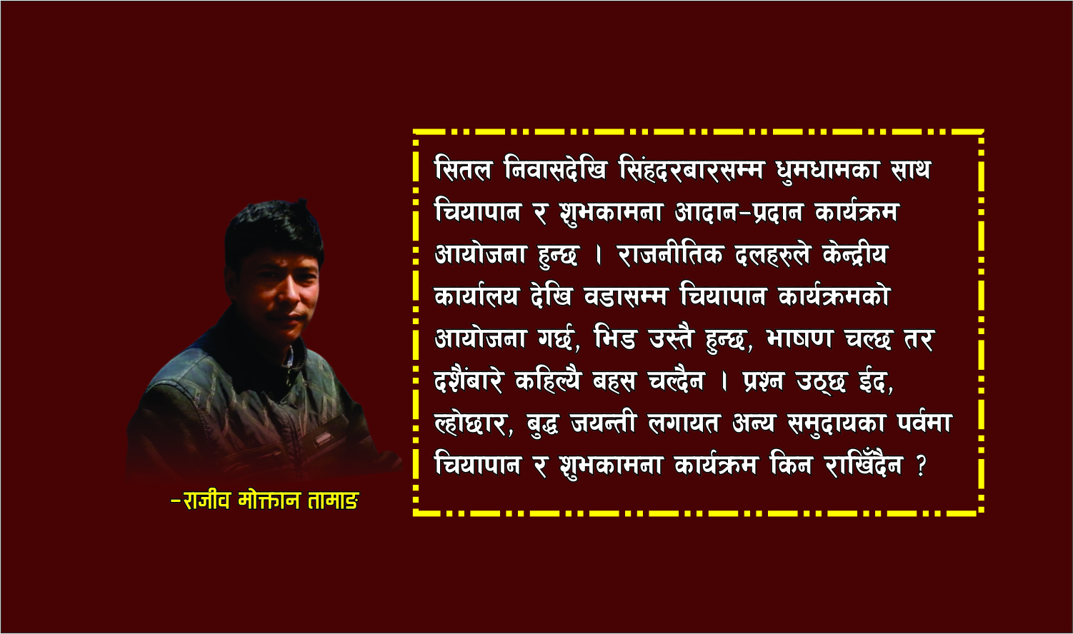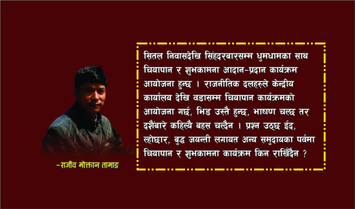 सितल निवासदेखि सिंहदरबारसम्म धुमधामका साथ चियापान र शुभकामना आदान–प्रदान कार्यक्रम आयोजना हुन्छ । राजनीतिक दलहरुले केन्द्रीय कार्यालय देखि वडा सम्म चियापान कार्यक्रमको आयोजना गर्छ,भिड उस्तै हुन्छ,भाषण चल्छ तर दशैंबारे कहिल्यै बहस चल्दैन । प्रश्न उठ्छ ईद, ल्होछार, बुद्ध जयन्ती लगायत अन्य समुदायका पर्वमा चियापान र शुभकामना कार्यक्रम किन राखिँदैन?