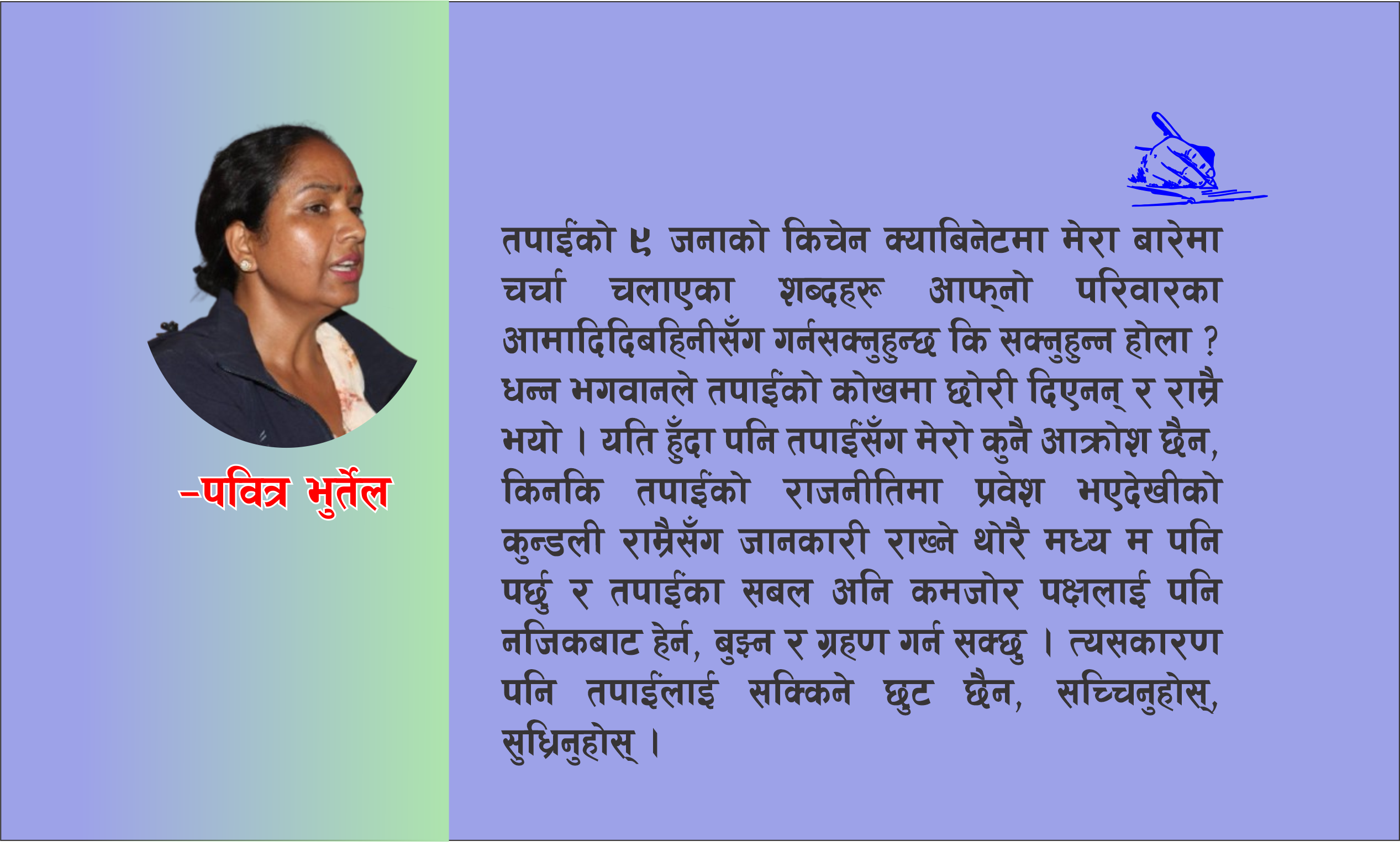 कमरेड, नेकपा एमाले बागमती प्रदेशको अधिवेशनमा तपाईंले जिताउन चाहेको मान्छे पराजित भएपछि नतिजा आएको २ दिन पश्चात् फोन गरेर “… लाई हराउने काममा त एक्लै लागेकी होस कि सामुहिक रुपमा हो” भनेर प्रश्न सोधेको झल्झली याद आउँछ । साथै सोही अधिवेशनको मतदानका क्रममा लाईन बसेको बेला “सिध्दाईदिने हो, कोपार्दिने हो, थाहा छ नी मैले सिध्याउनु पर्यो भने कसरी सिध्याउँछु भन्ने कुरा..” भनेर सार्वजनिक रूपमा मप्रतिको तपाईंको अभिव्यक्ति सायदै मेरो वरिपरि हुने अन्य कमरेडहरुले भुल्नुहोला । तर मेरो लागि त त्यो कुनै नौलो विषय छँदै थिएन, तपाईंका यस्ता रुखा र कर्कस वाक्यांश त केटाकेटी बेला देखिनै पचाउँदै परिपक्क हुँदै, आफुलाई निखार्दै अनि प्राप्त जिम्मेवारीलाई निर्भिकतापुर्वक सबैखाले असहजतालाई छिचोल्दै यो अवस्था सम्म आईपुगेको हुँ ।