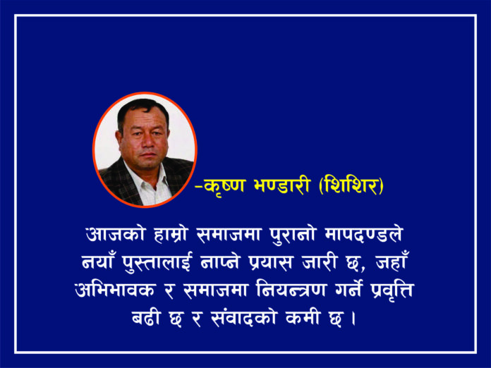 यो बदलिएको आजको हाम्रो समाजमा पुरानो मापदण्डले नयाँ पुस्तालाई नाप्ने प्रयास जारी छ, जहाँ अभिभावक र समाजमा नियन्त्रण गर्ने प्रवृत्ति बढी छ र संवादको कमी छ । सुन्नुभन्दा निर्देशन दिने बानी, साथै डिजिटल पुस्तालाई पुरानो/परम्परागत तरिकाले बुझ्ने गर्दा युवा आफ्ना विचार, अनुभव र भावनासँग सम्बन्धित महसुस गर्न पाउँदैनन् । परिणामस्वरूप, युवा केवल नजिक छैनन्, बरु क्रमशः टाढिँदै गइरहेका छन् ।